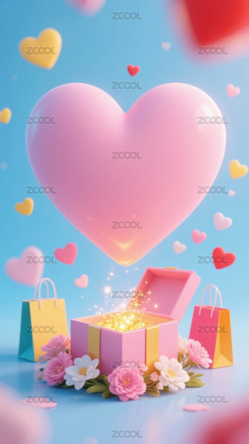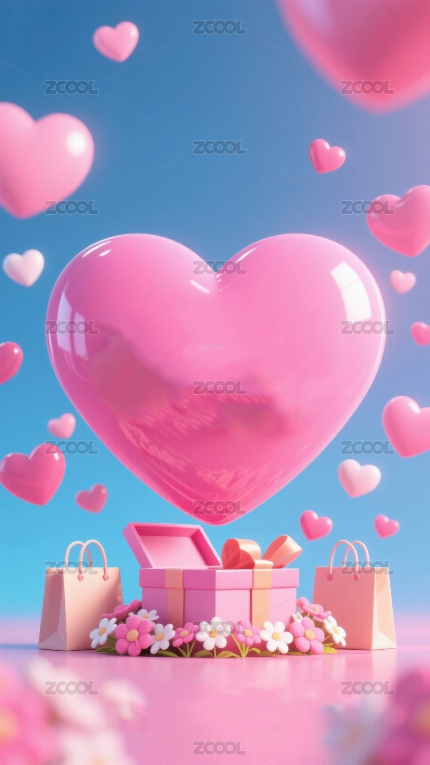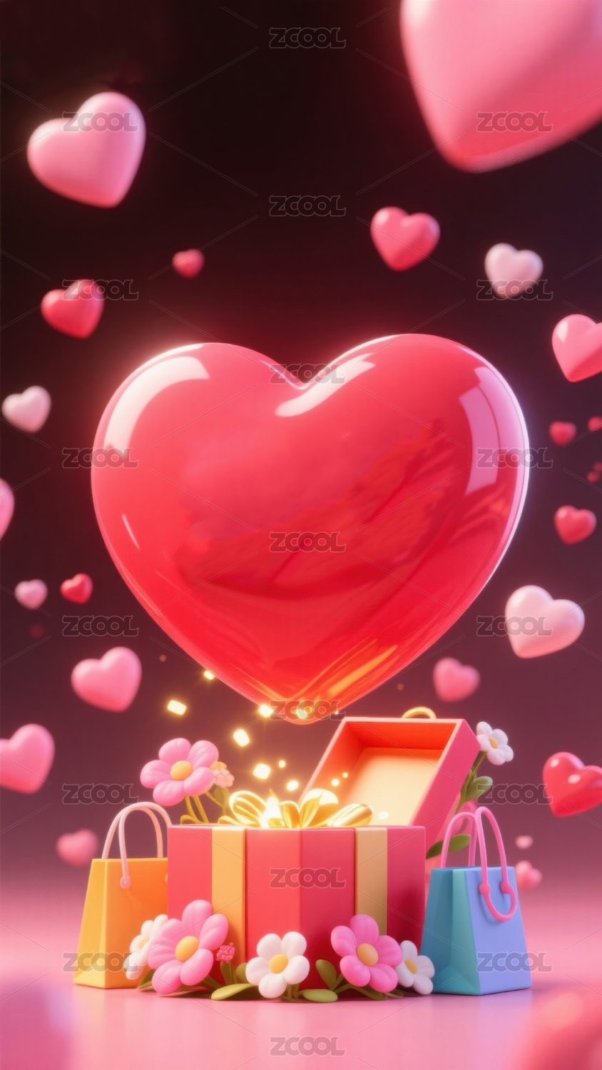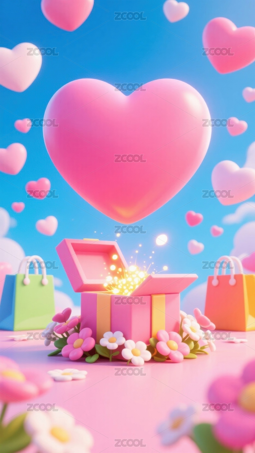 粉色爱心与礼物盒的梦幻场景