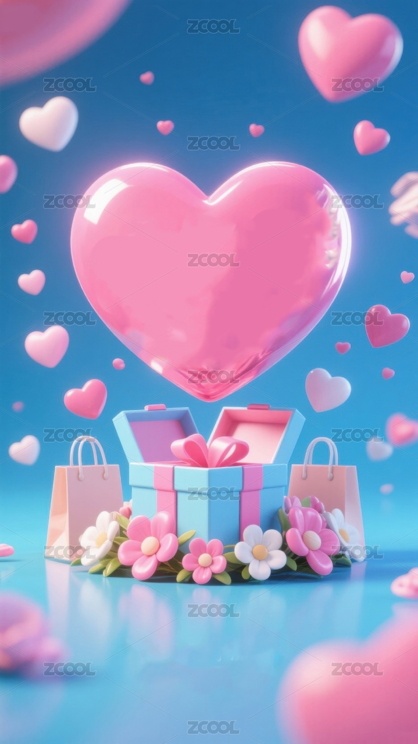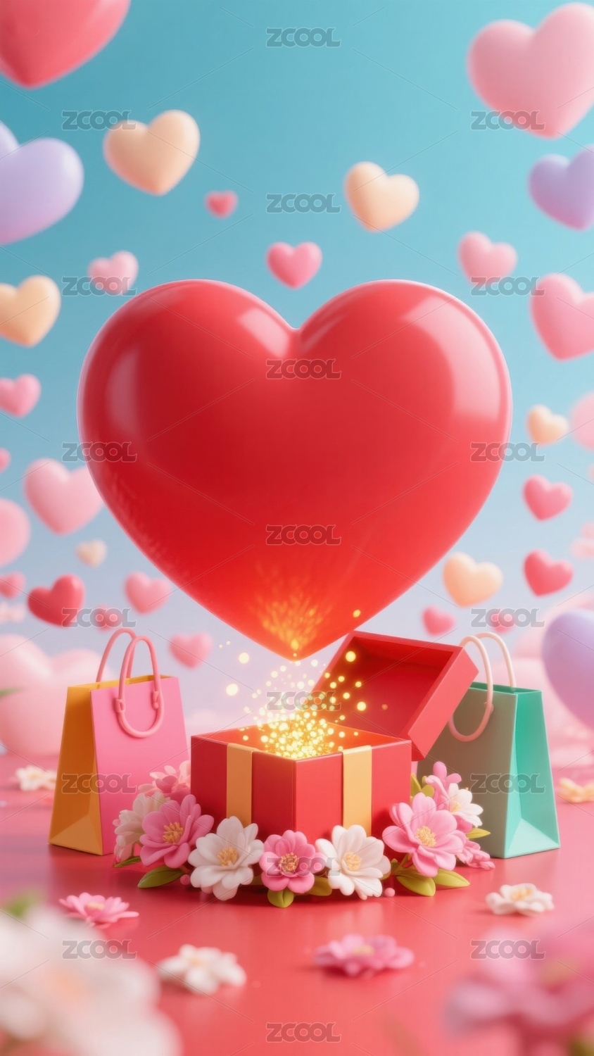 心形礼物盒与漂浮爱心