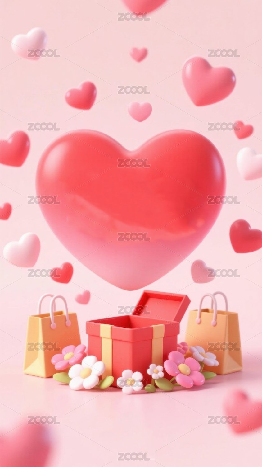 粉色爱心与礼盒的浪漫场景