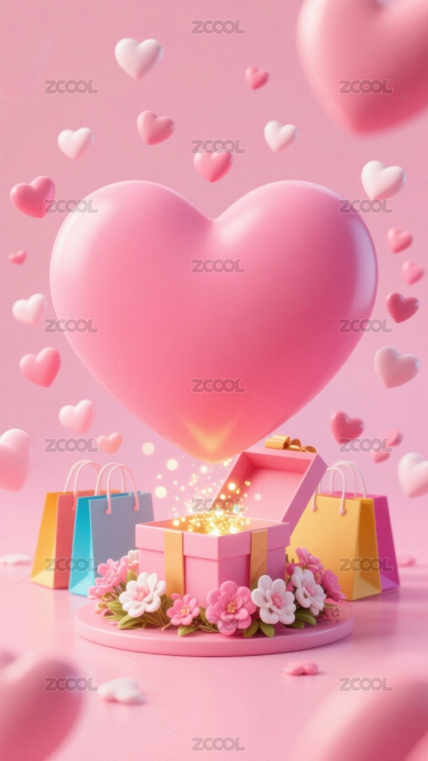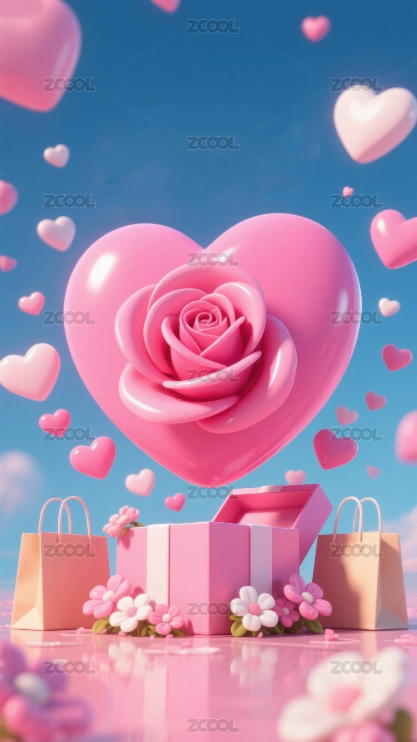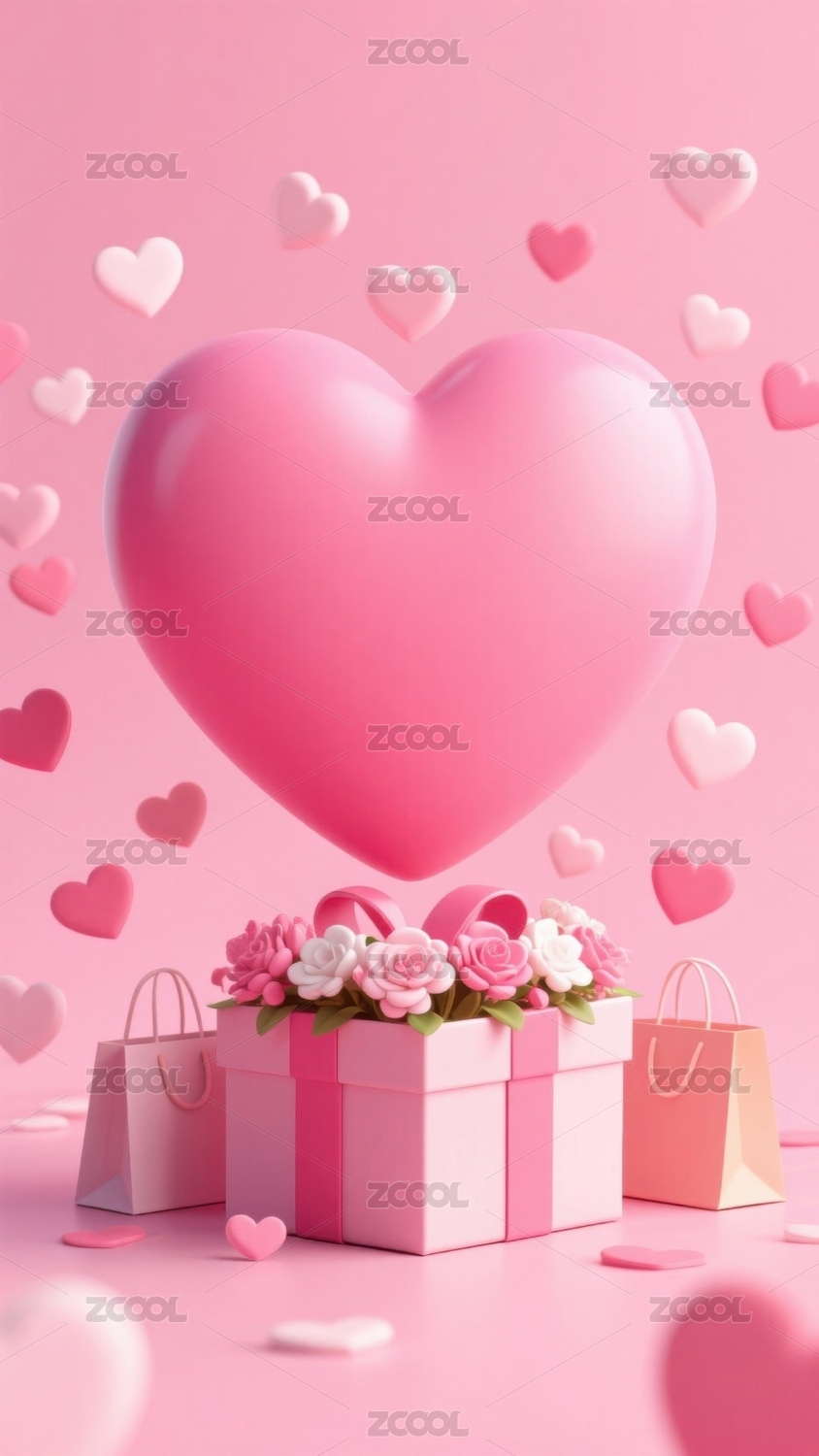粉色心形玫瑰与购物袋的浪漫场景