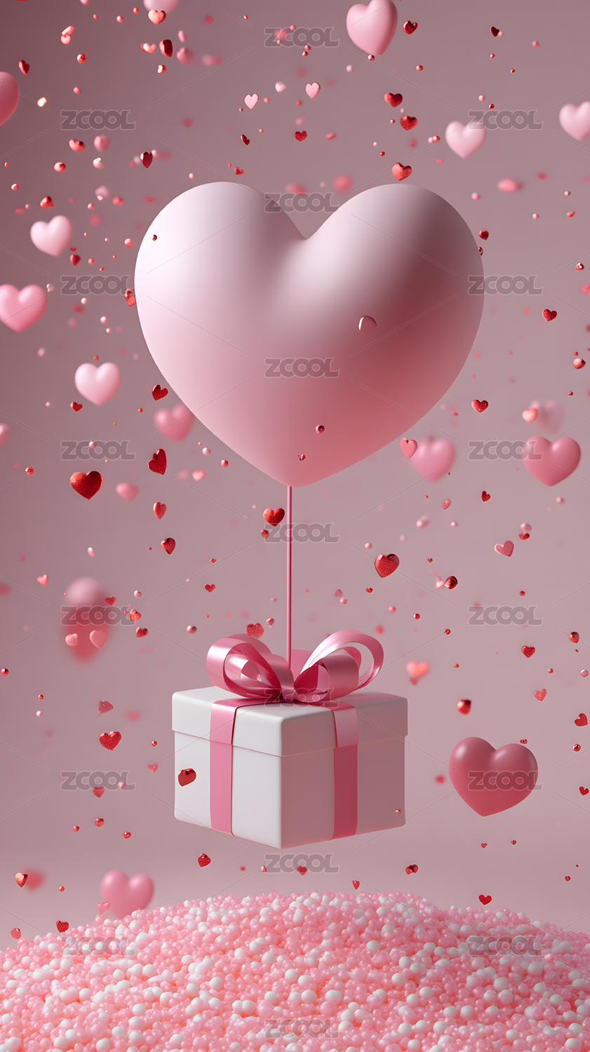 粉色心形气球与礼物盒的浪漫场景