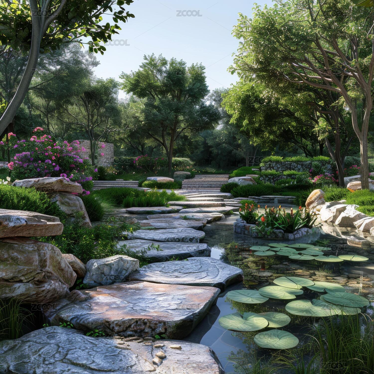 郁郁葱葱的花园中铺有石板的小路和池塘