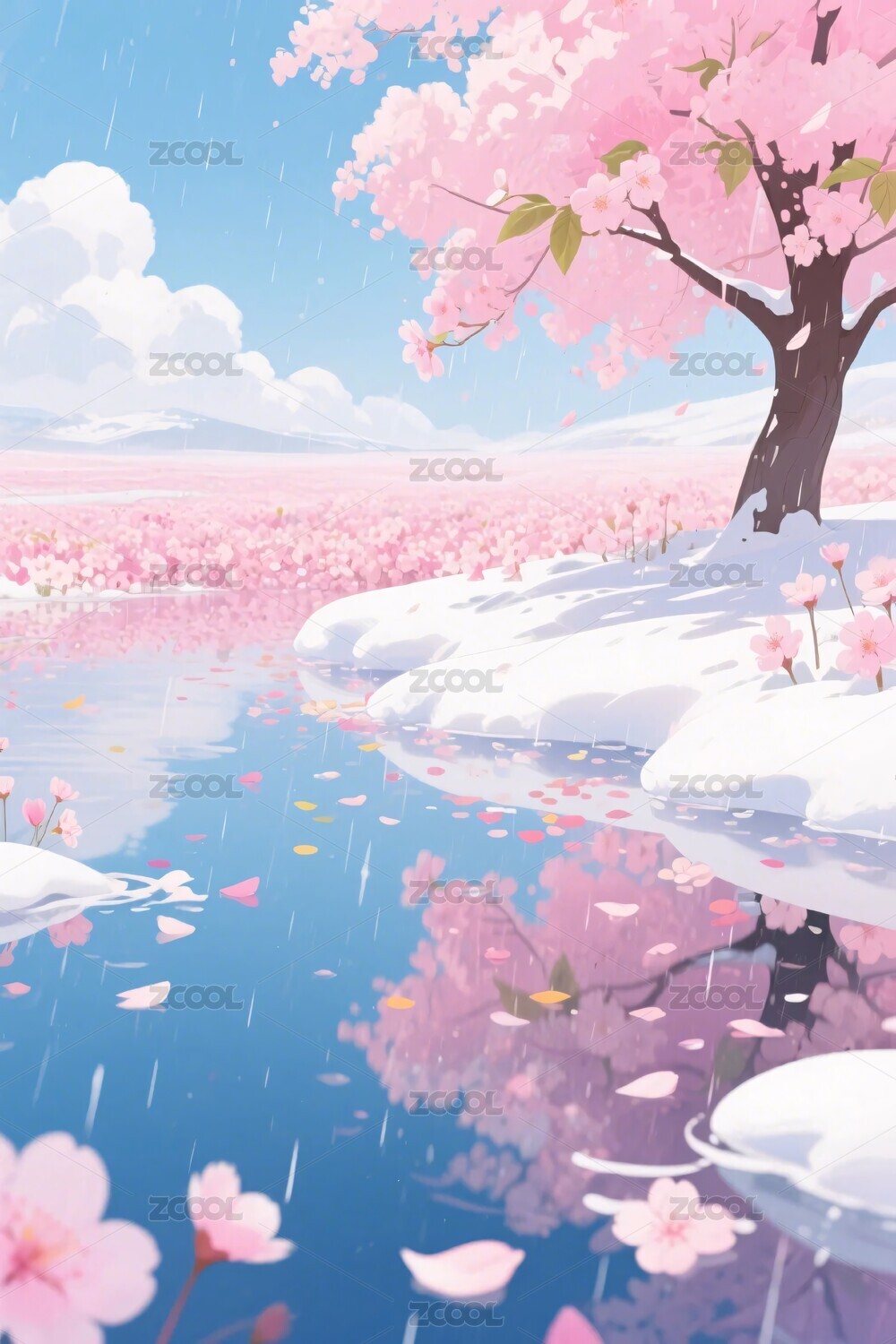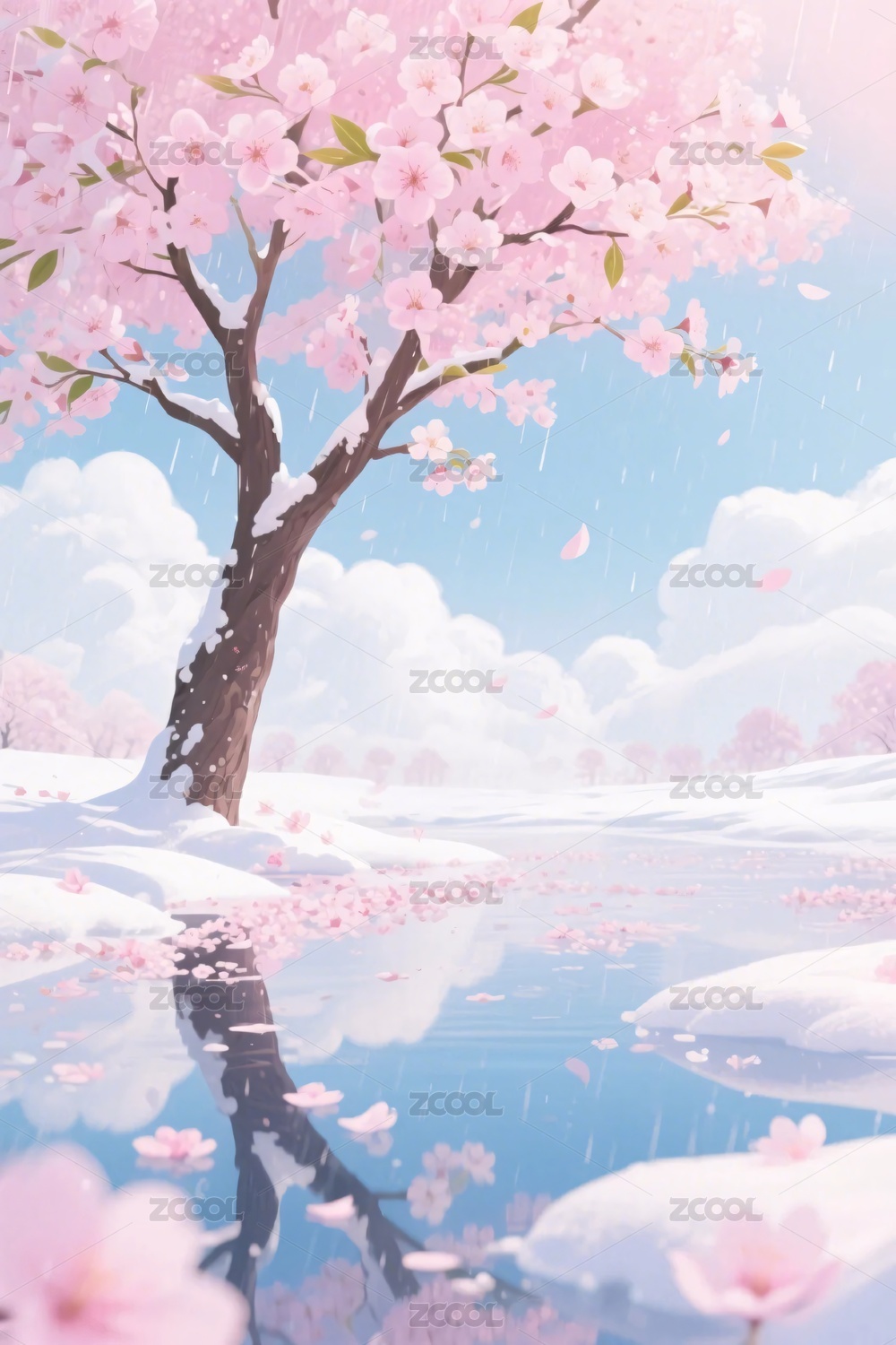 樱花,雪地,樱花树,蓝天,水面,倒影,风景,插画,数字艺术,唯美