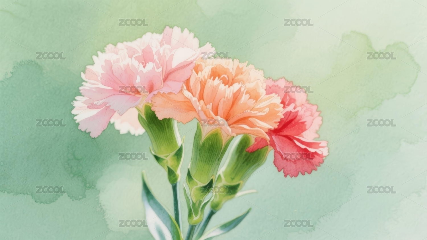 康乃馨,花朵,水彩,插画,花卉,绿叶,植物画,装饰画,柔和,花束