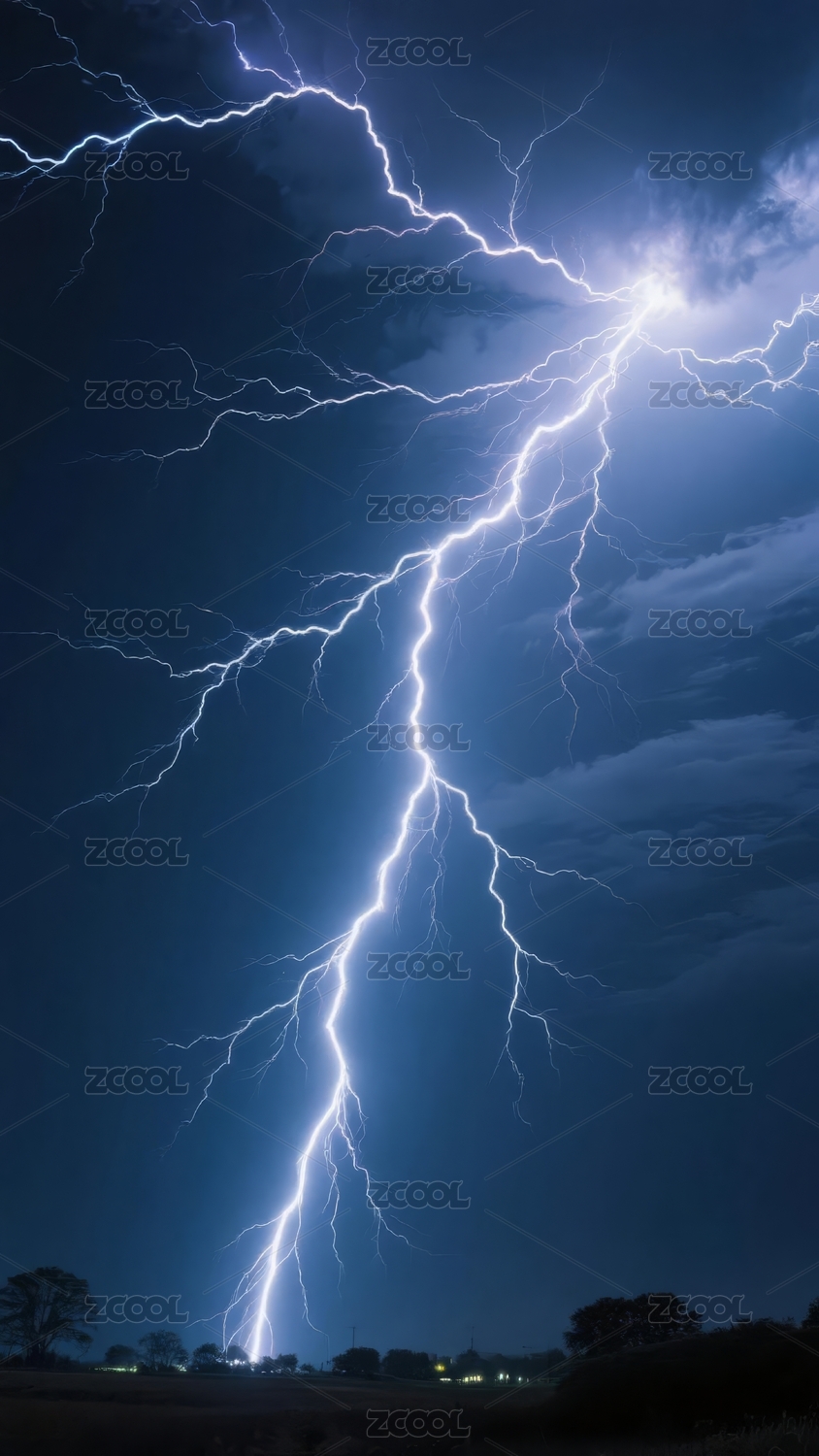 夜空中震撼的闪电划破天际照亮树林