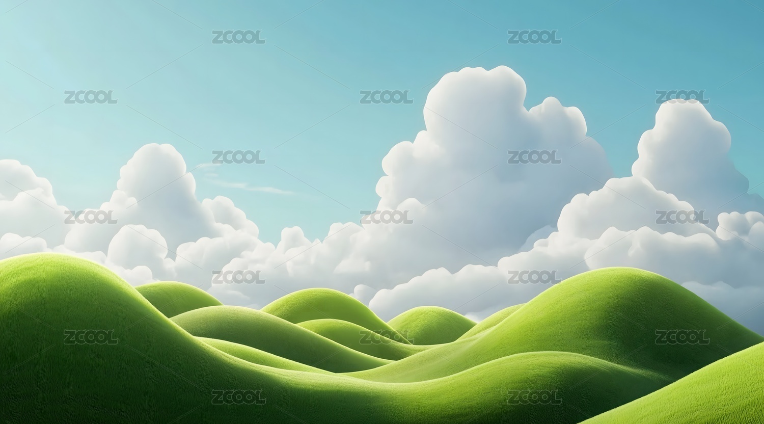 3d渲染卡通蓝天白云绿草地