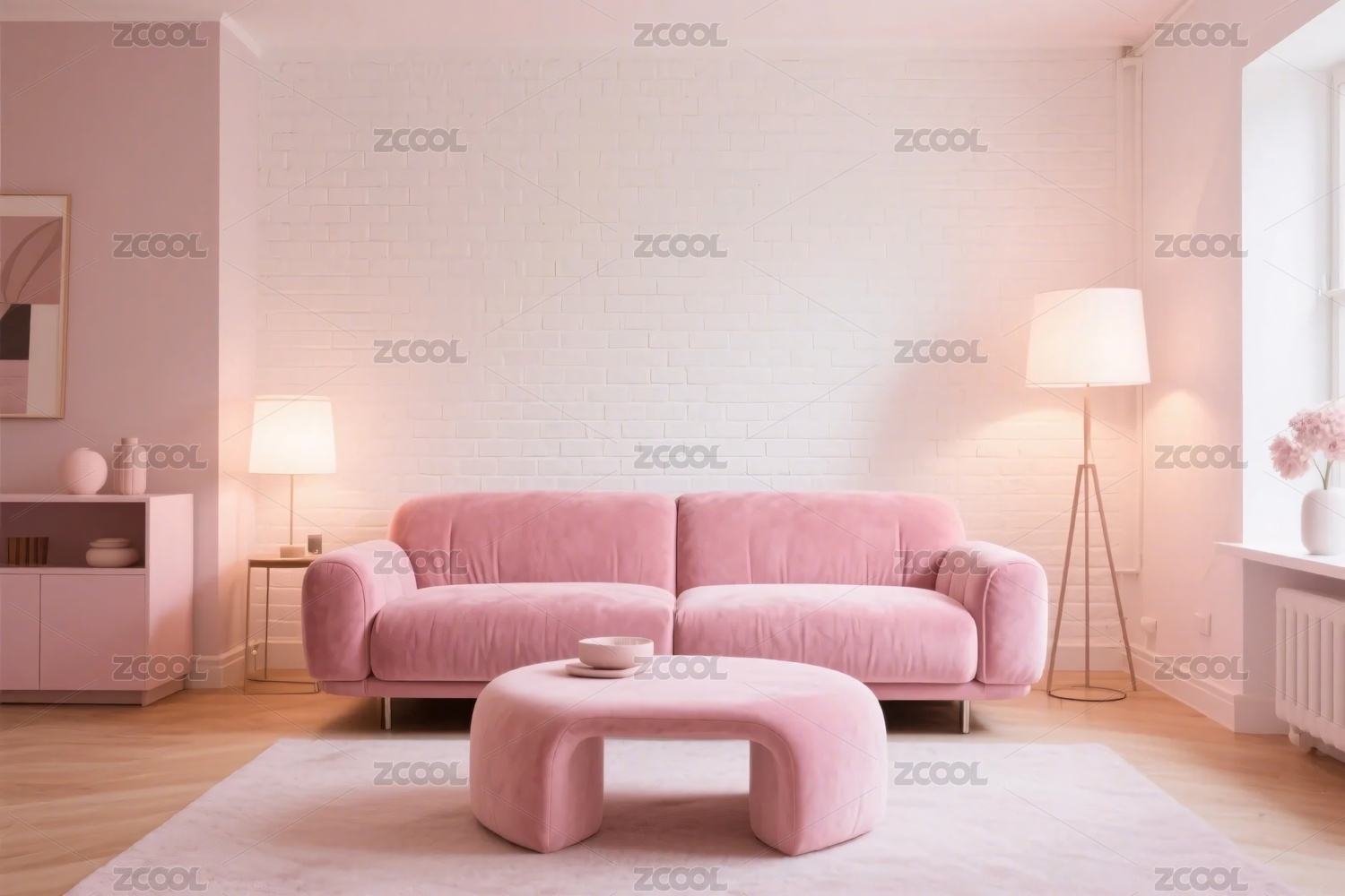 沙发,绿植,书架,落地灯,装饰画,粉色墙,室内空间,简约风格,温馨,布置