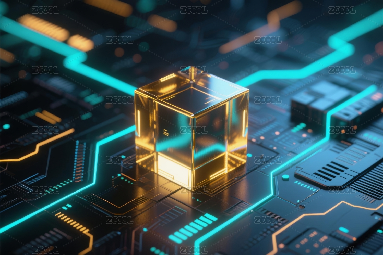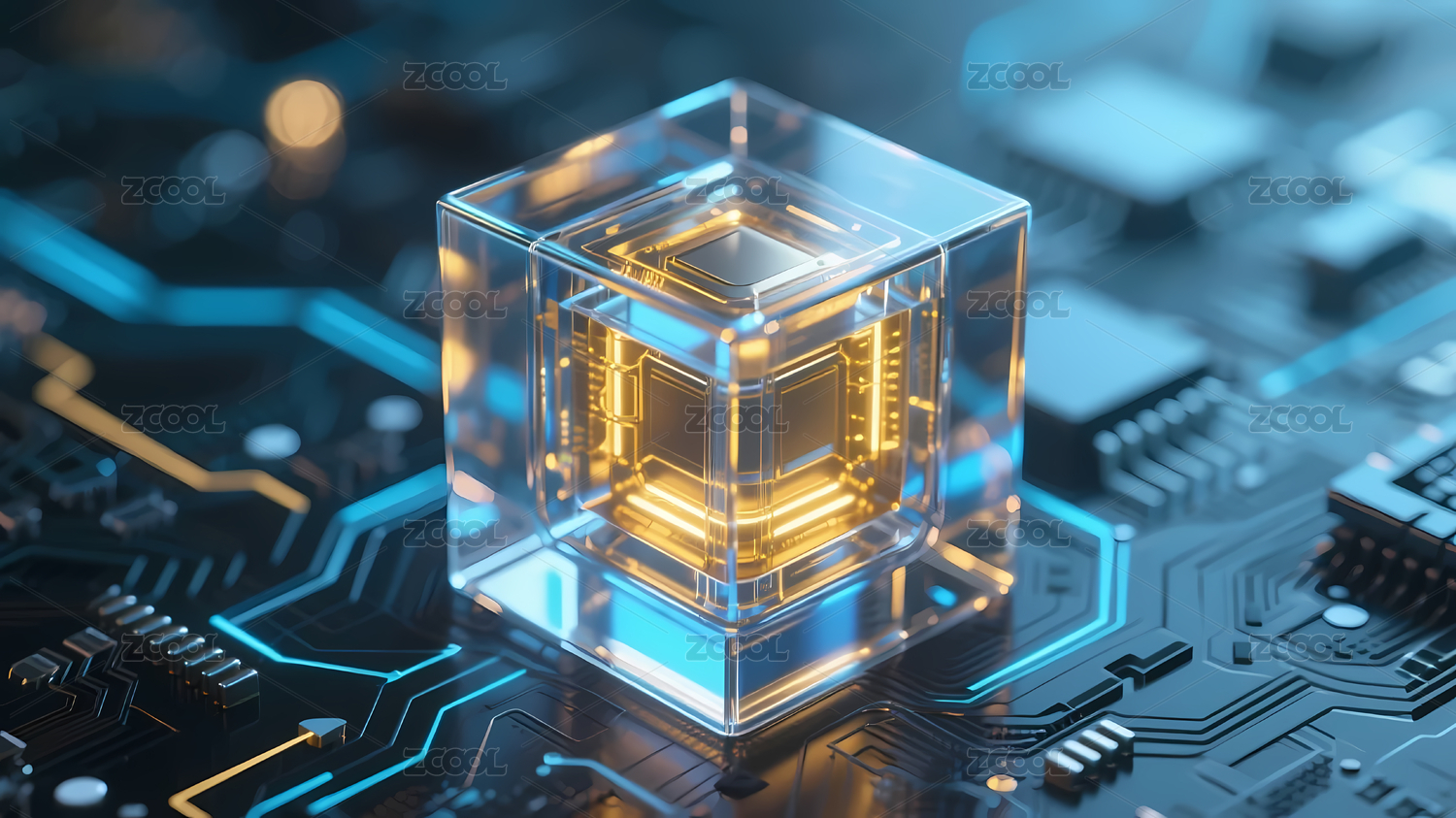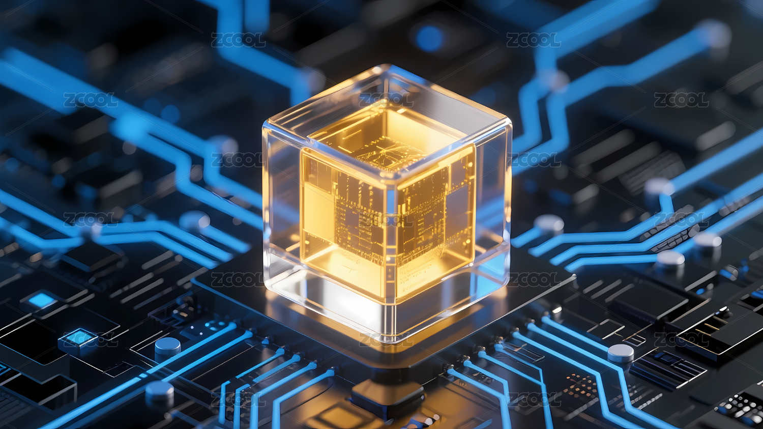 深蓝,蓝色,温暖,金色,发光,电路板,芯片,透明,未来感,高科技