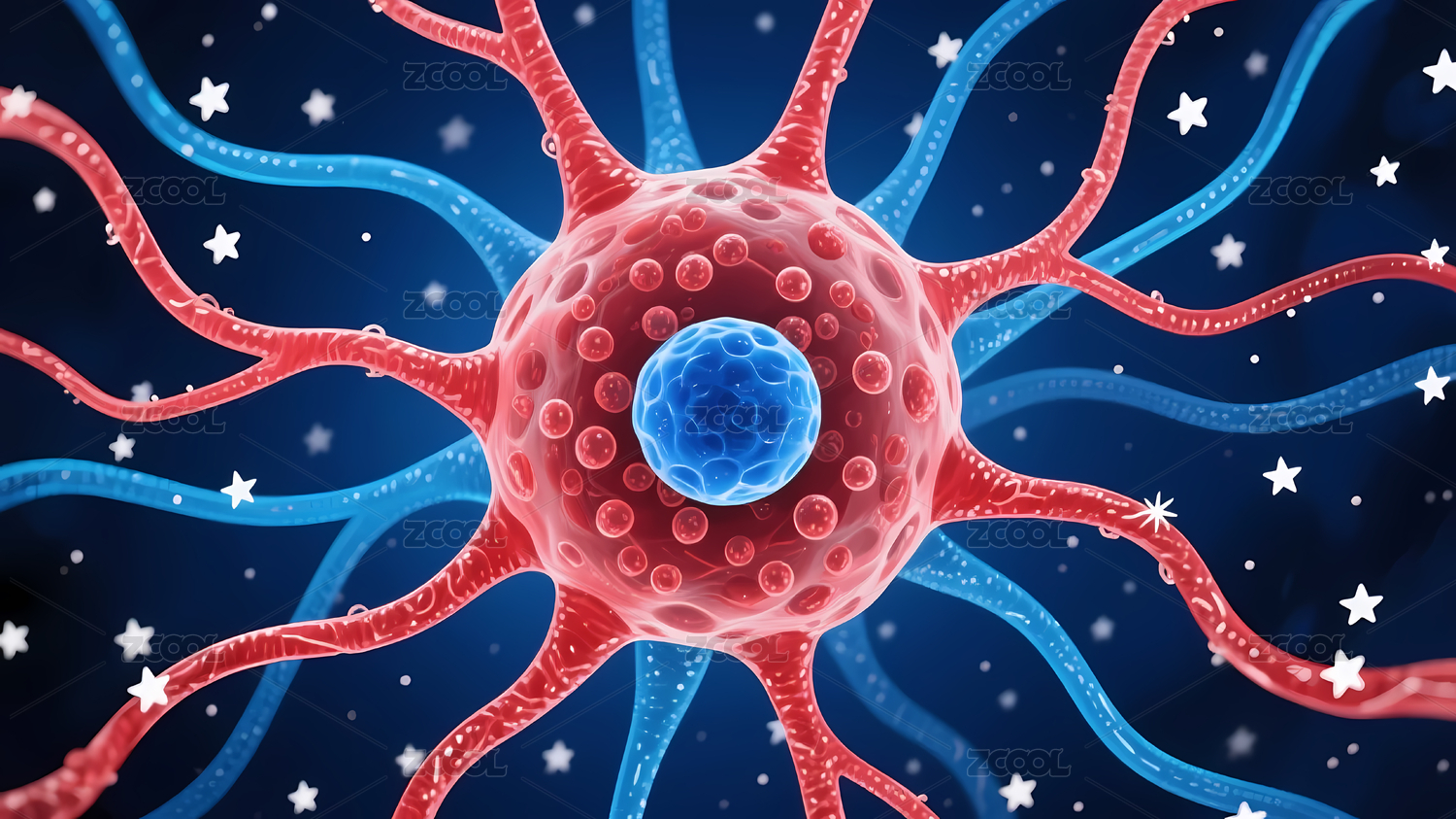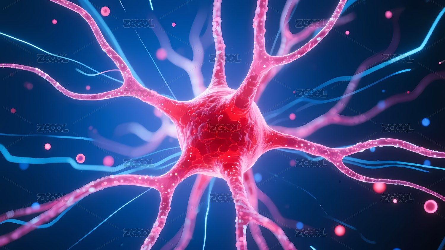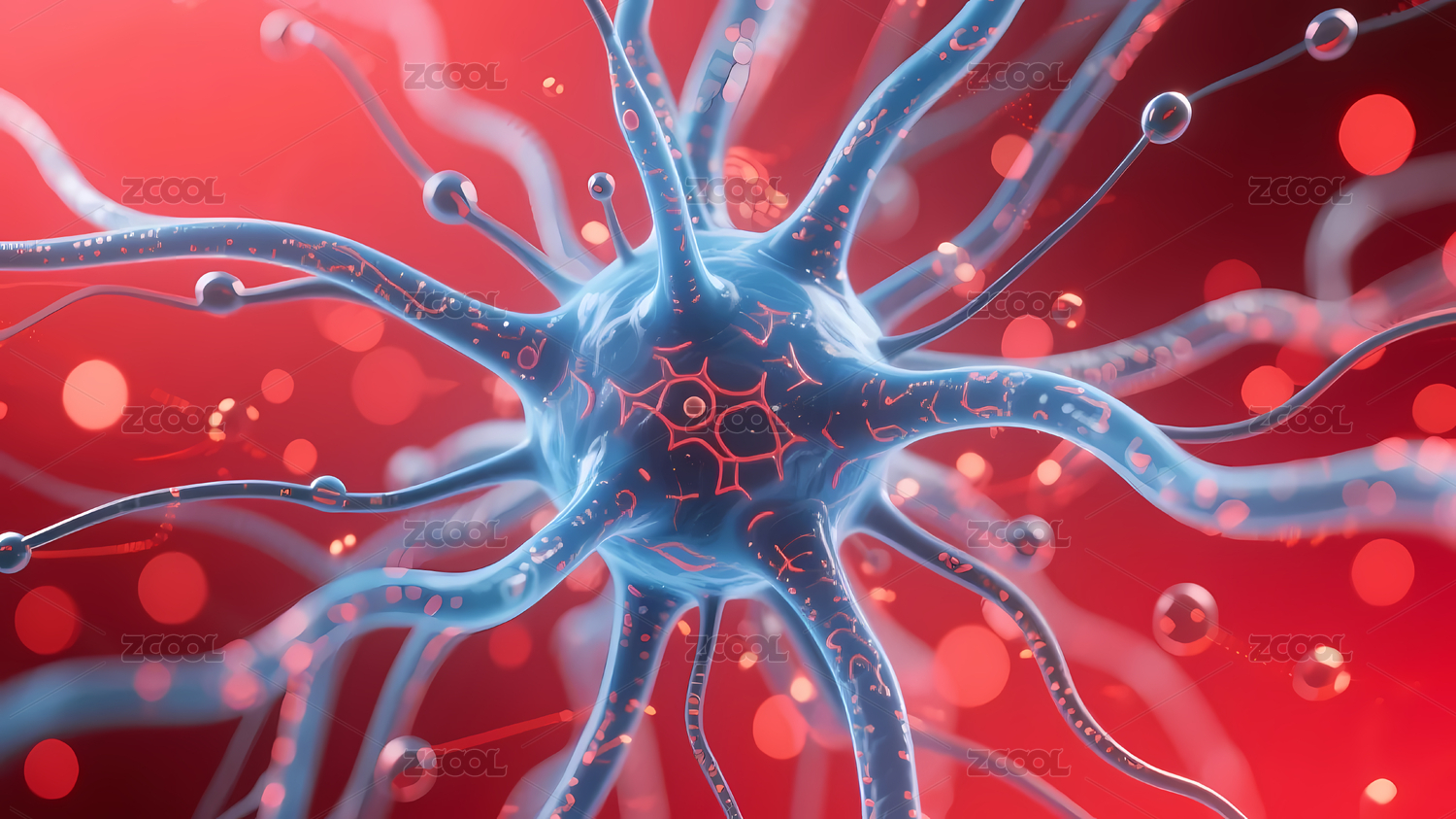 红色神经元细胞点缀蓝色背景