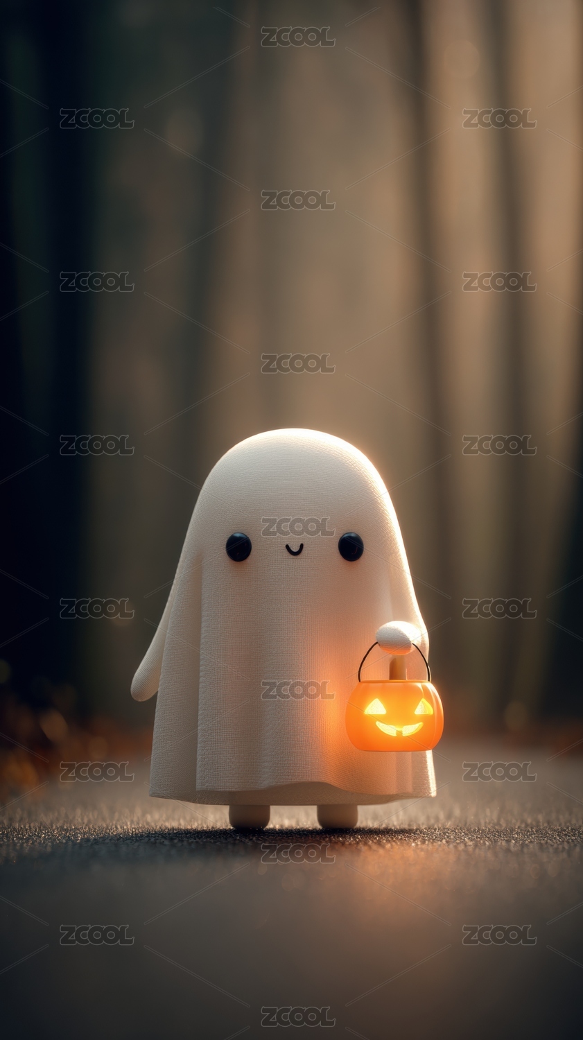 万圣节插图可爱提灯幽灵游荡夜间墓园