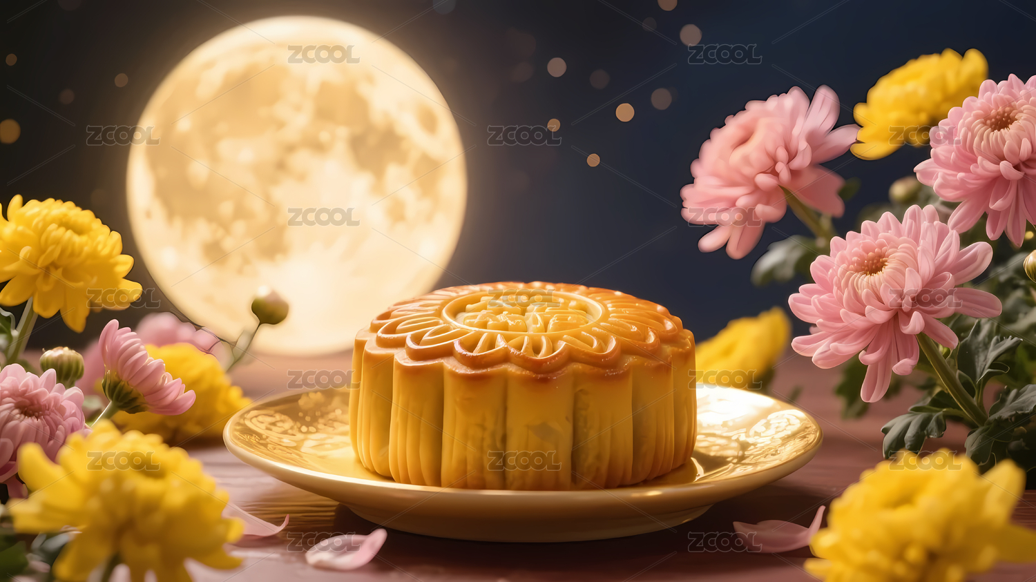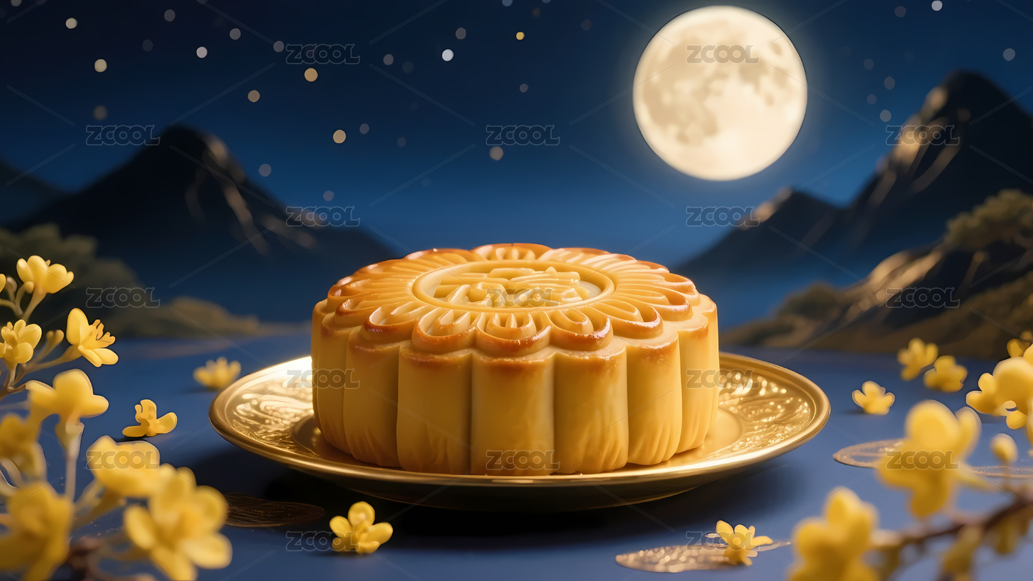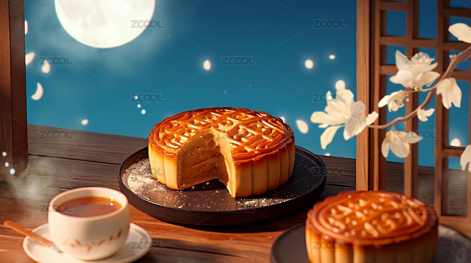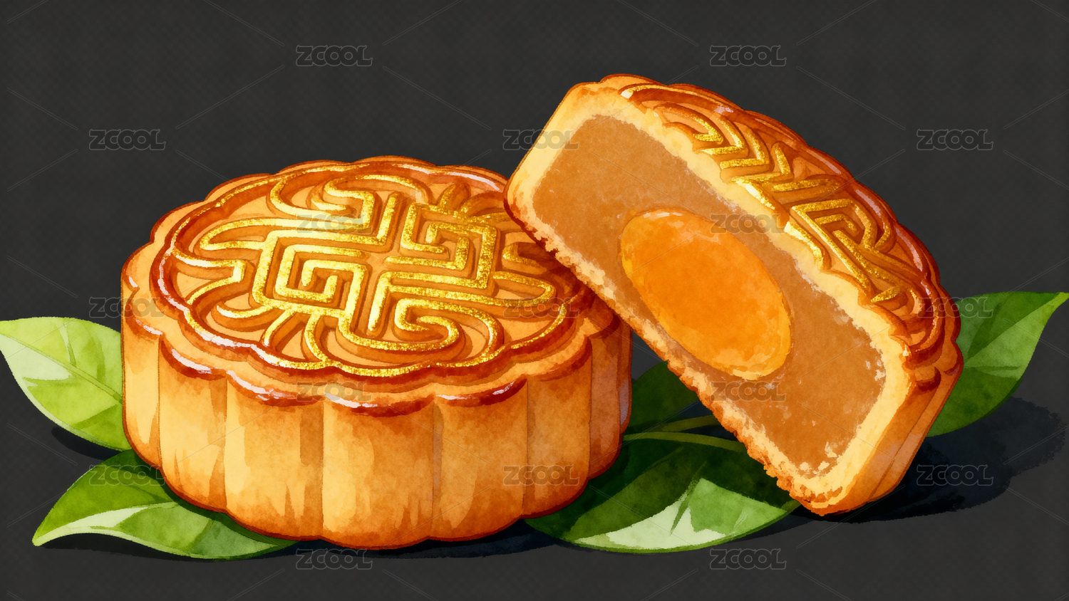 月饼,中秋,美食,建筑,食物,节日,自然,背景,团圆,水彩