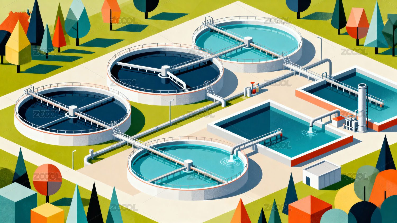 彩色插画展示污水处理厂