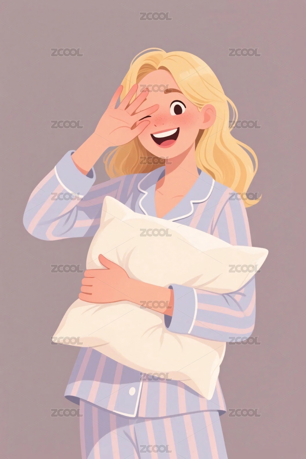 卡通女孩抱枕头挥手