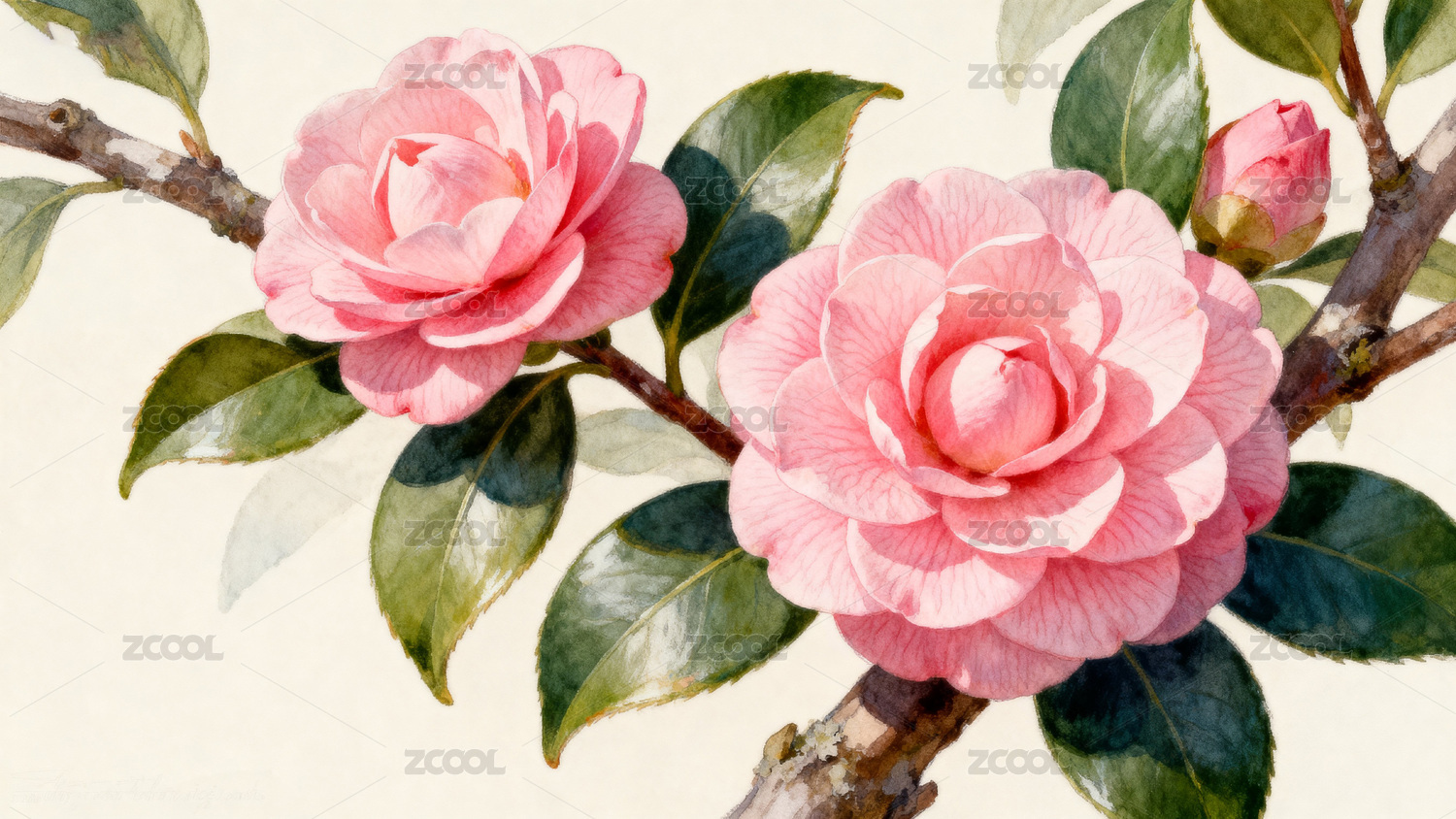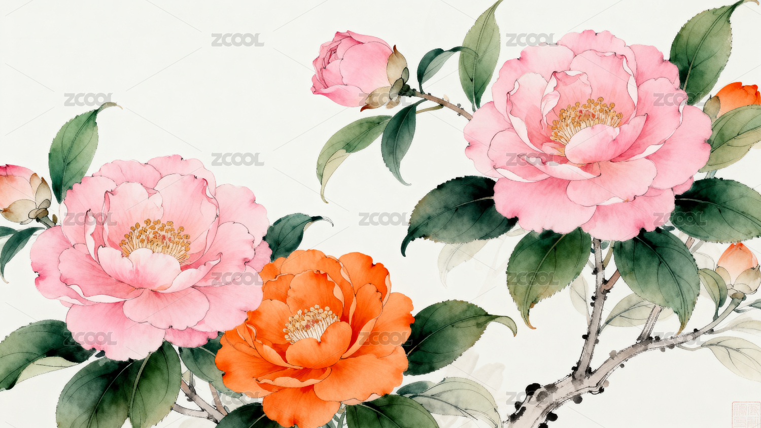 水彩花卉茶花插画