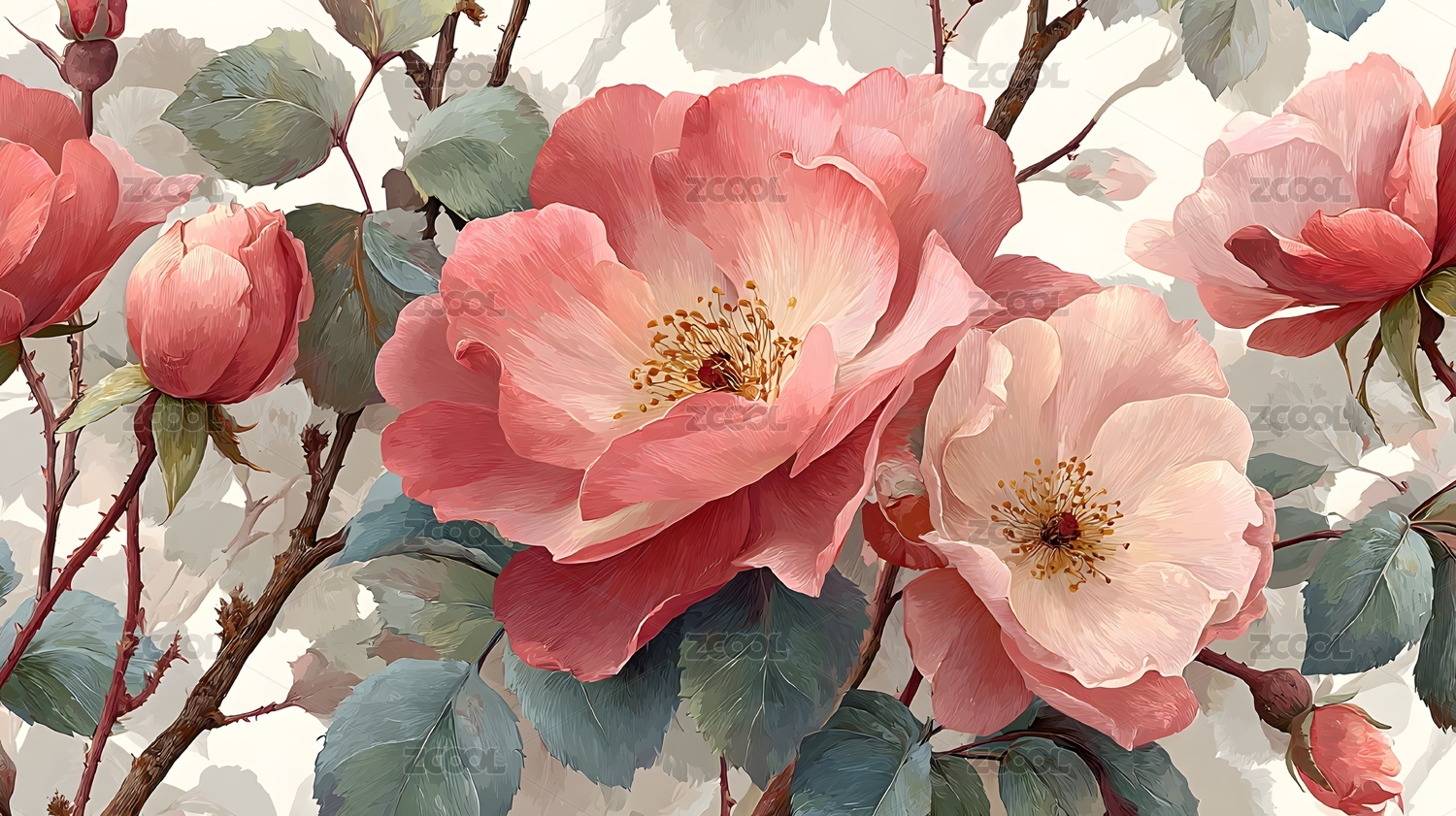 粉色花朵与绿叶的细腻水彩画