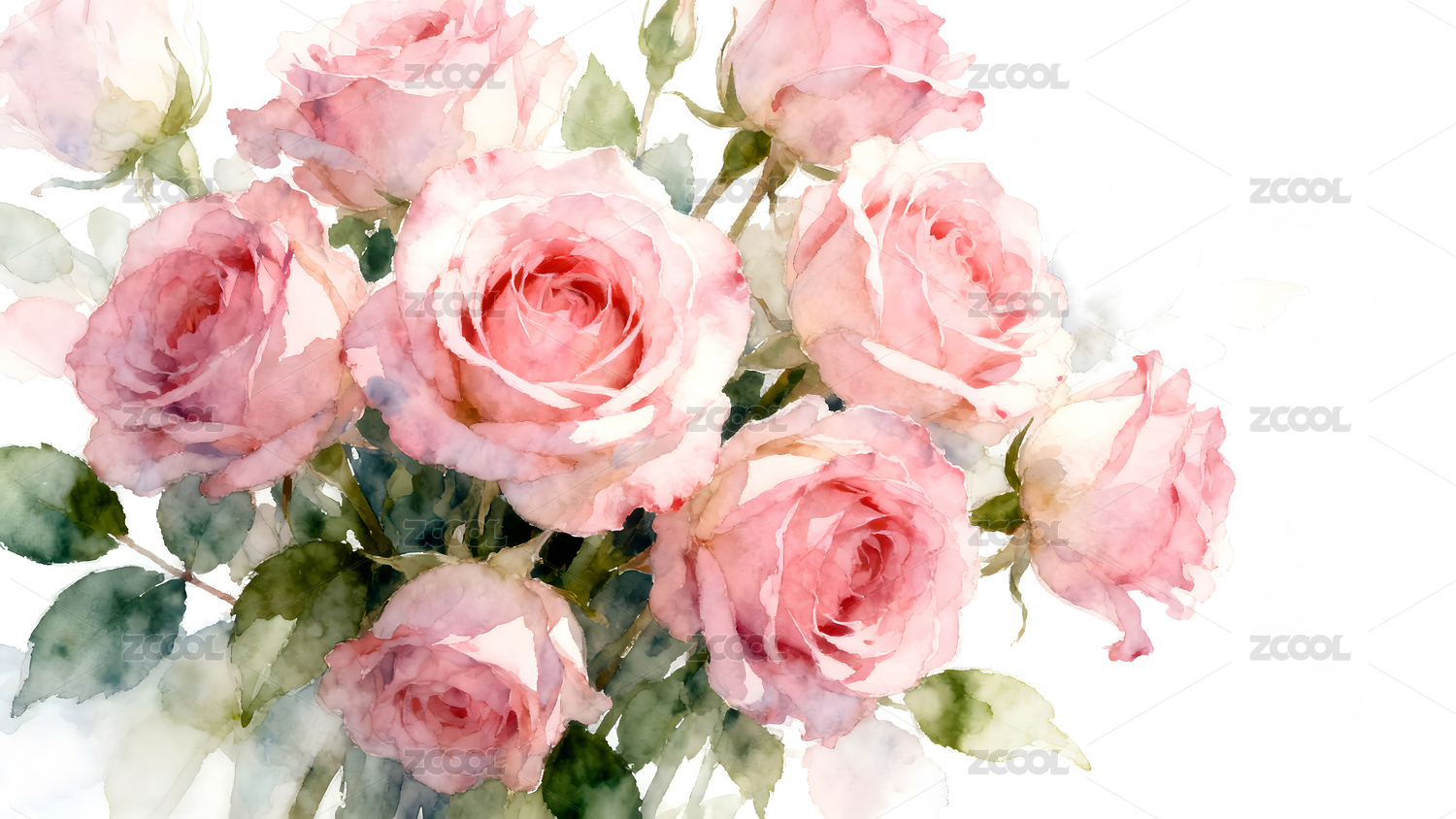水彩玫瑰花束优雅绽放