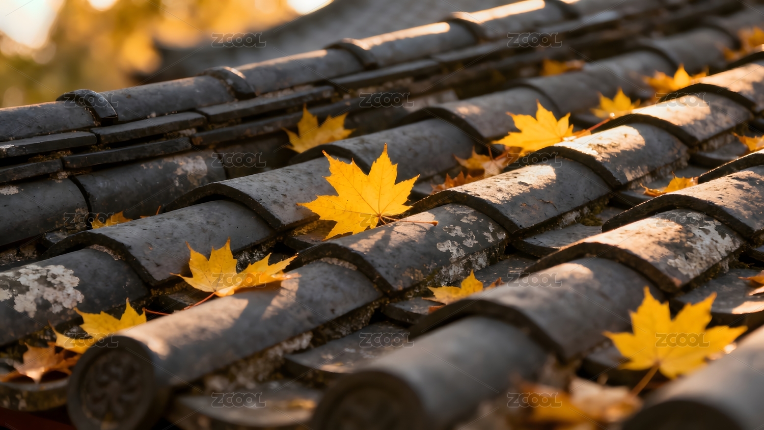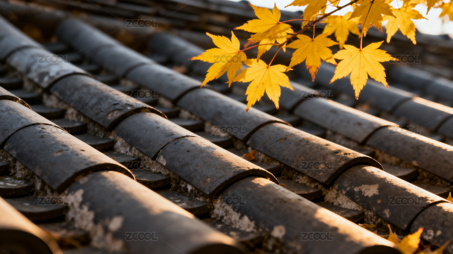 秋叶点缀古瓦屋顶