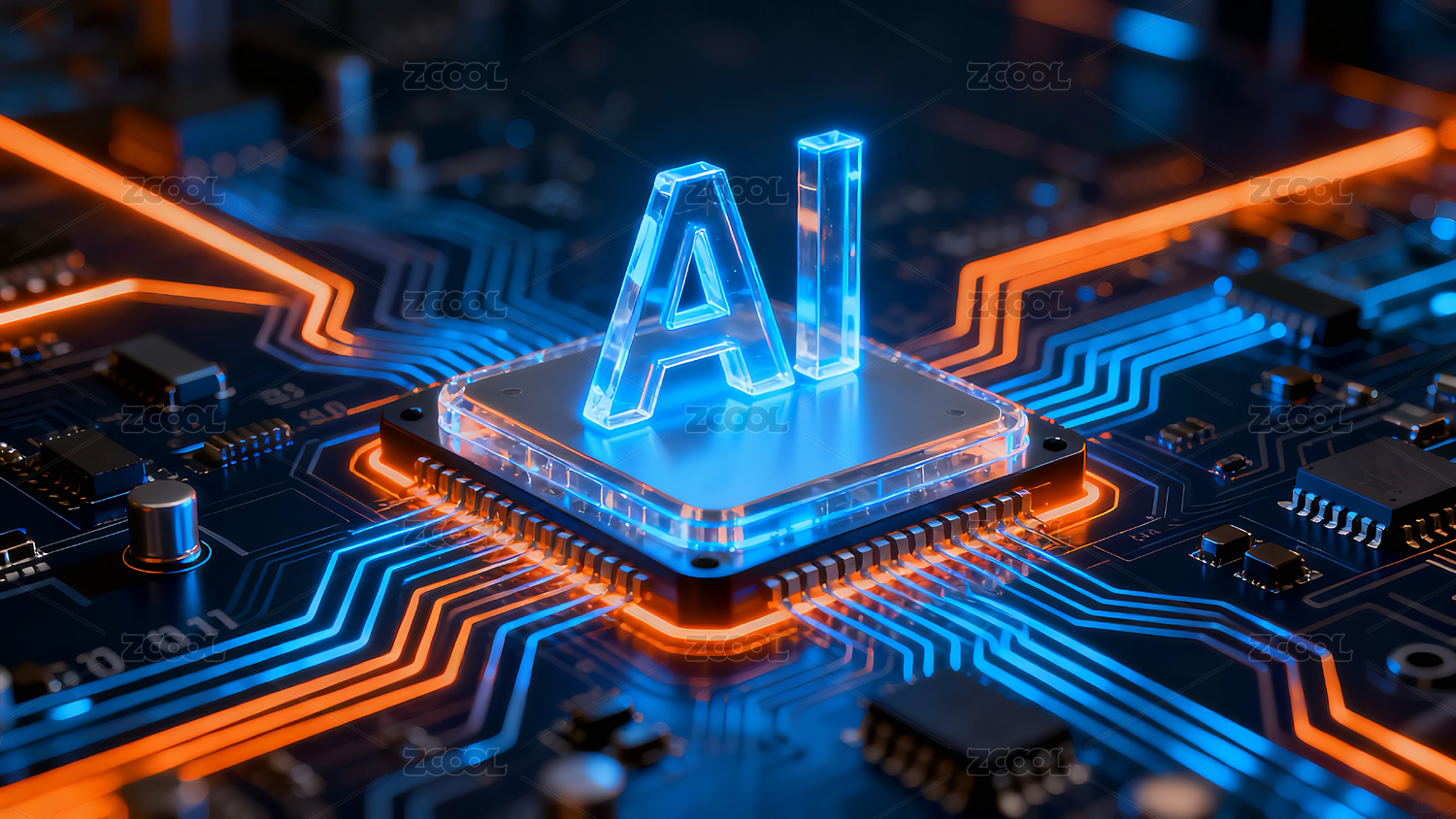 人工智能,AI芯片,电路板,三维,场景,蓝色,光影,3D,数据流,传输