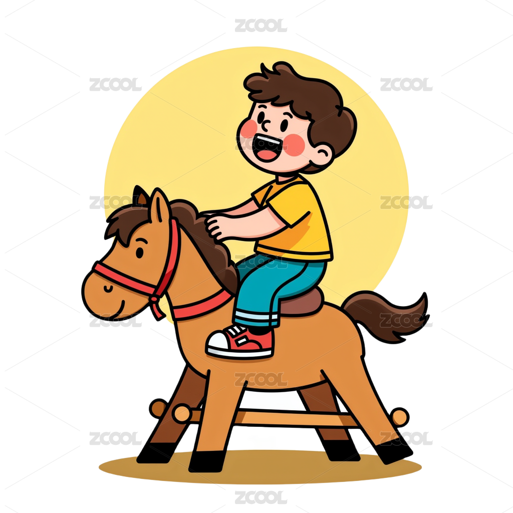 卡通男孩骑木马玩具开心大笑小朋友儿童插画