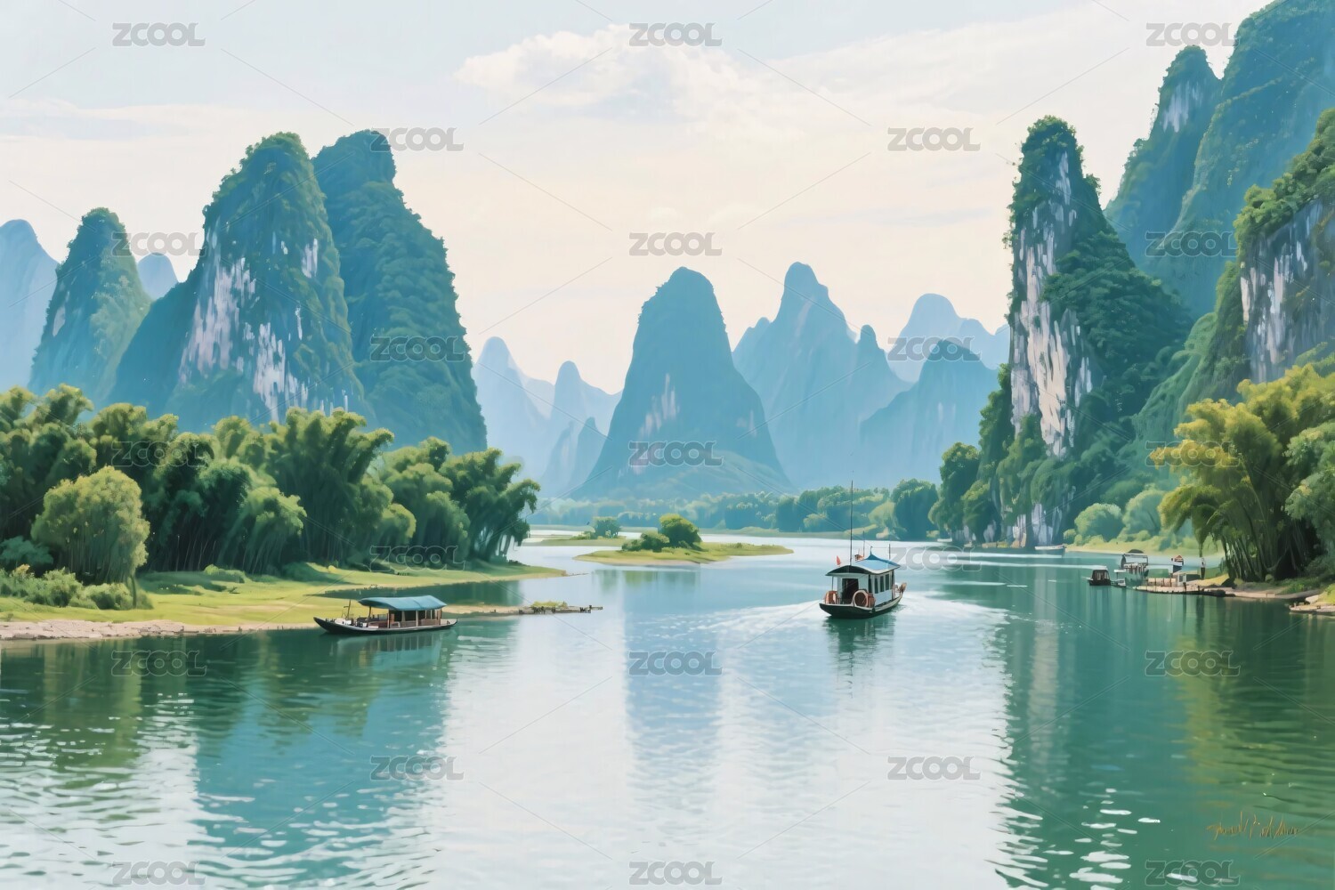 山水,风景,河流,山峰,插画,自然,山水画,田园,自然景观,绘画