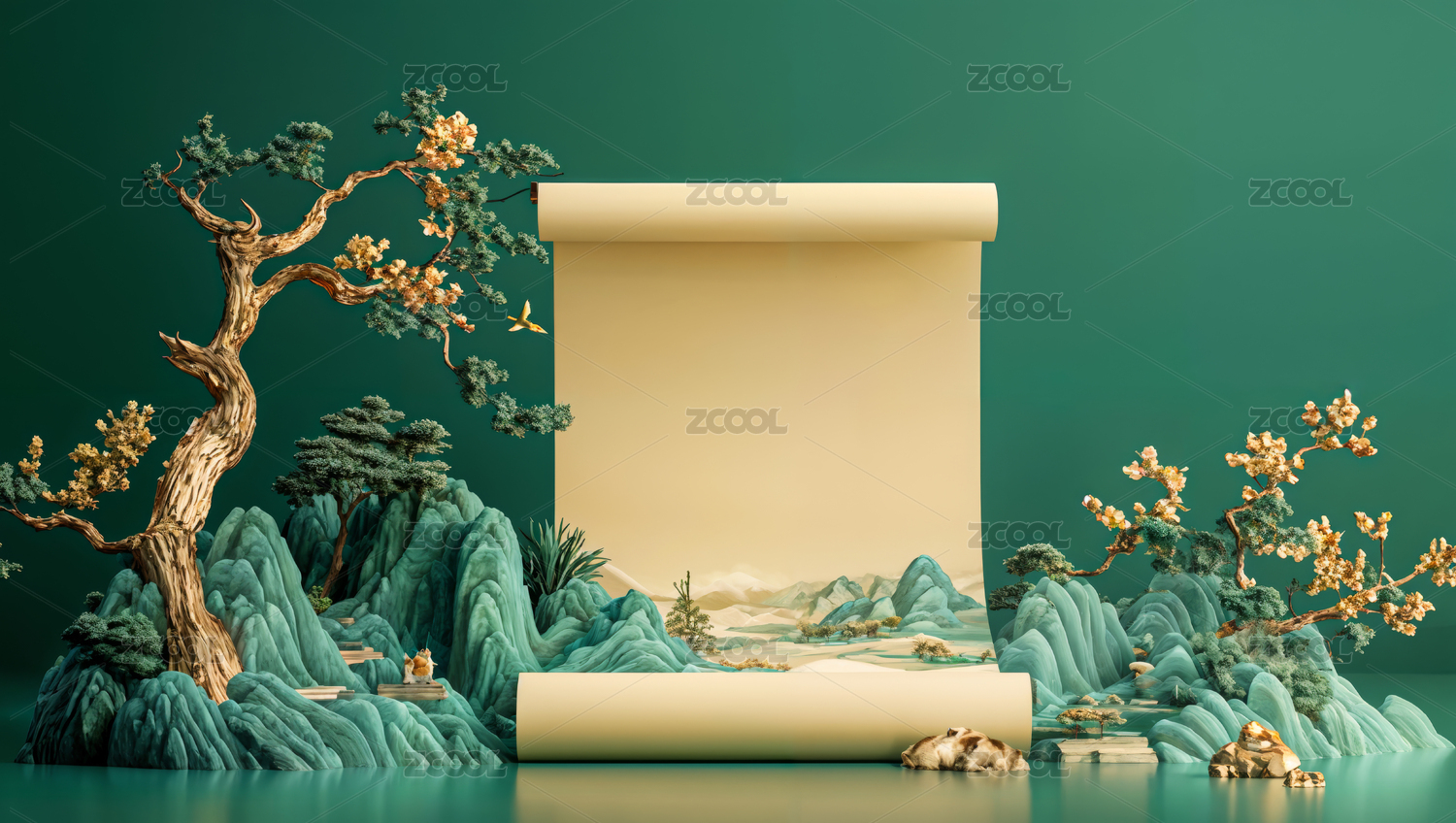 3D中国风山水风景中的书卷