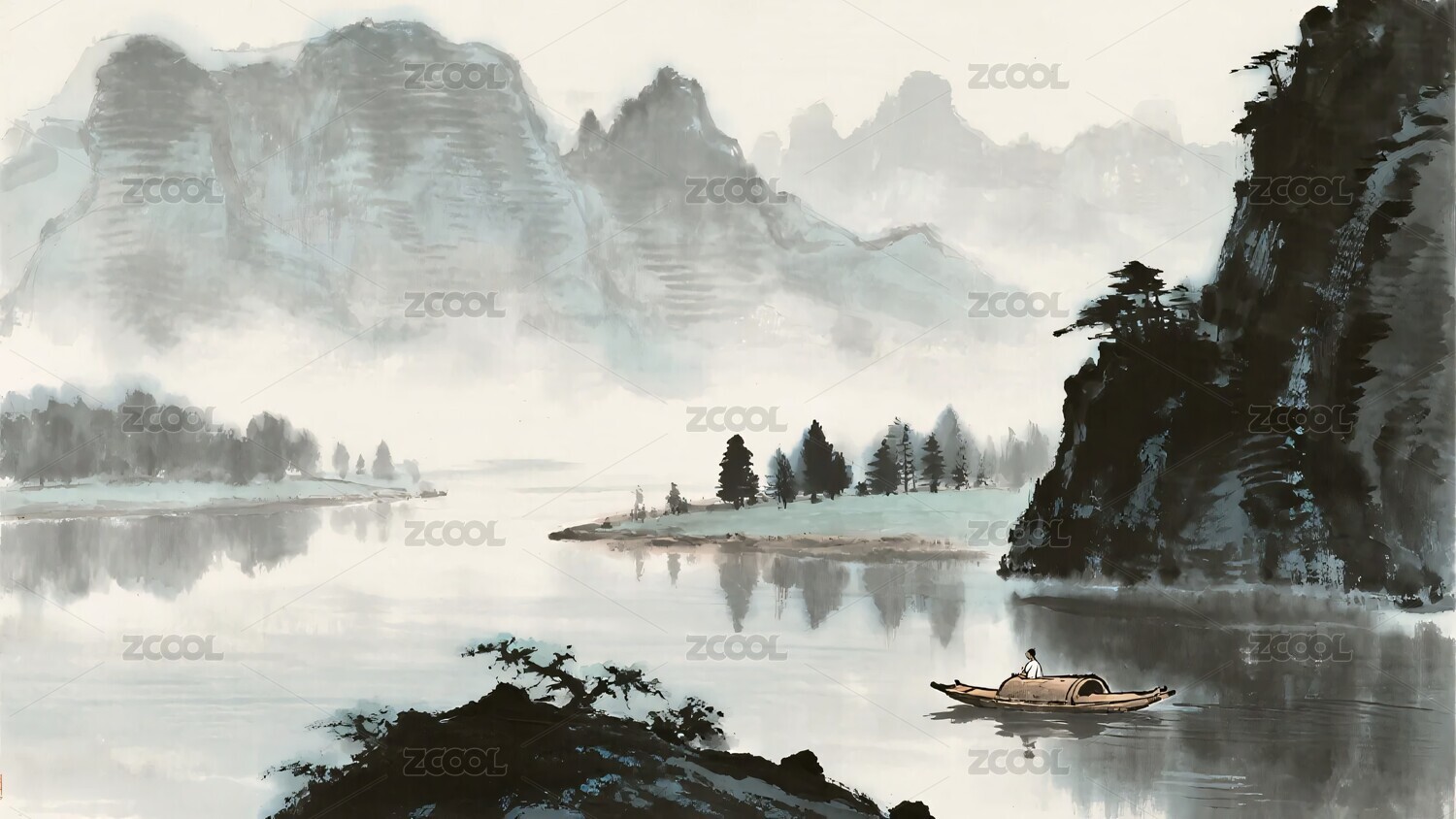 水墨山水间的孤舟图景