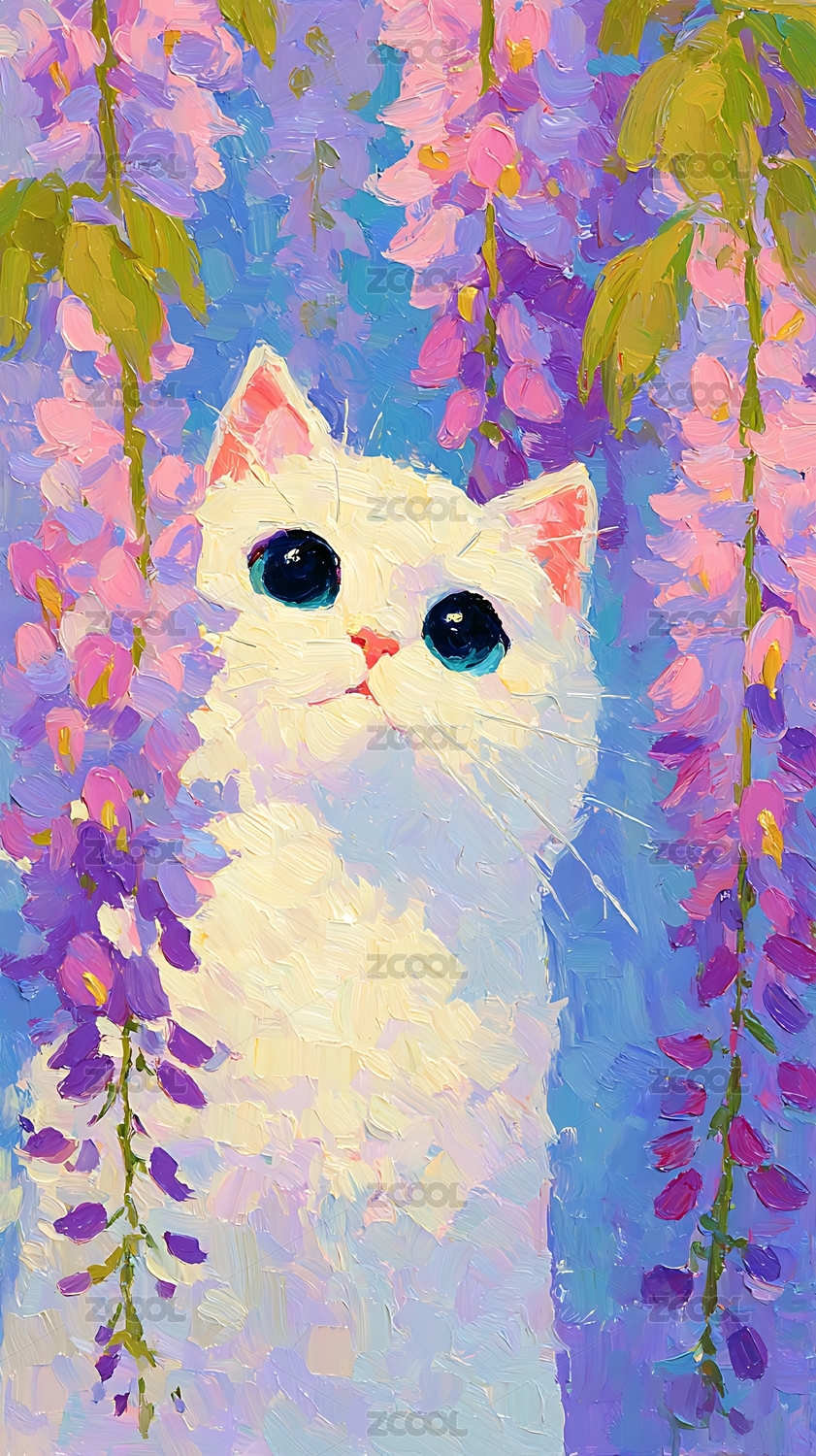 梦幻唯美可爱猫咪小花手机插画壁纸