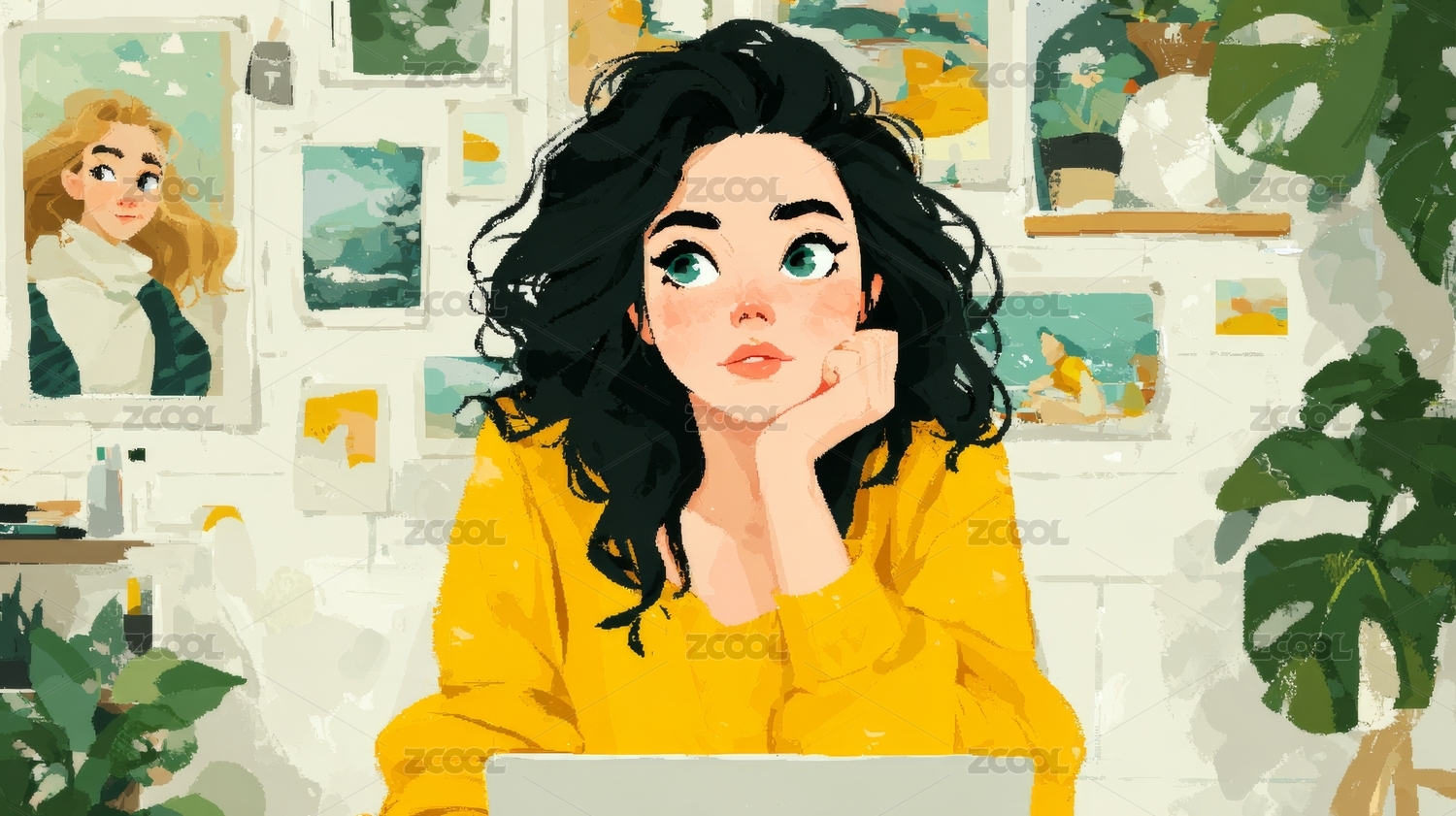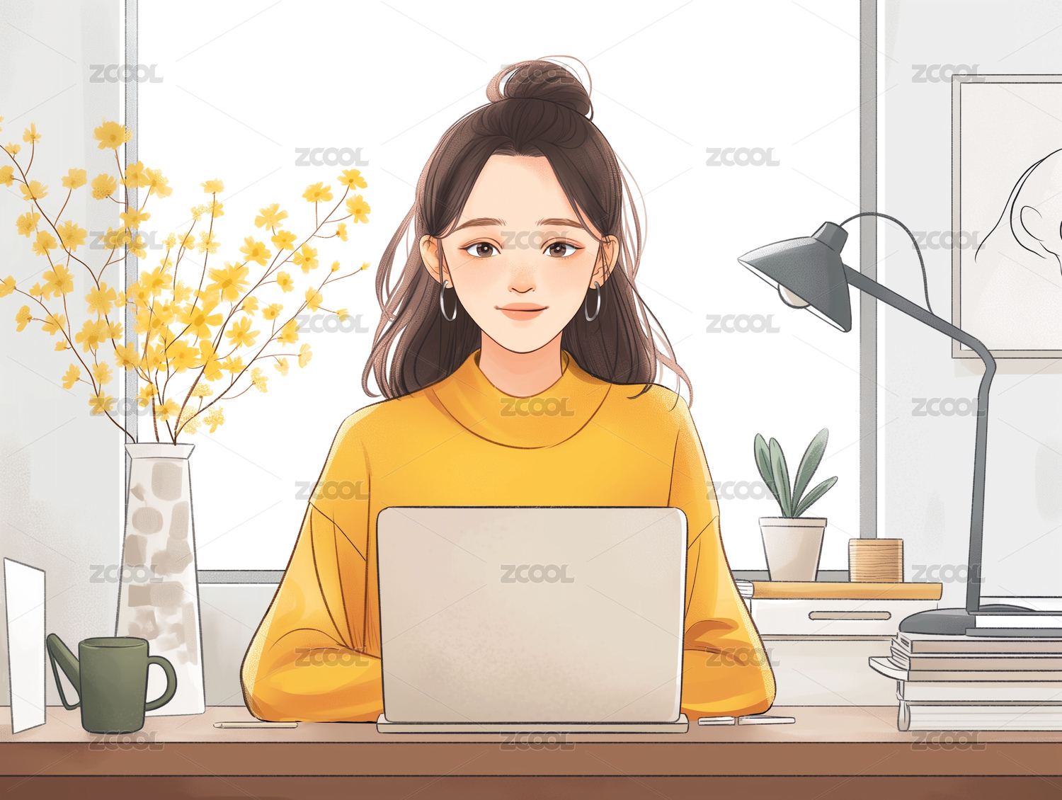 女孩,居家,办公,文艺,创意,工作,笔记本,电脑,室内,绿植