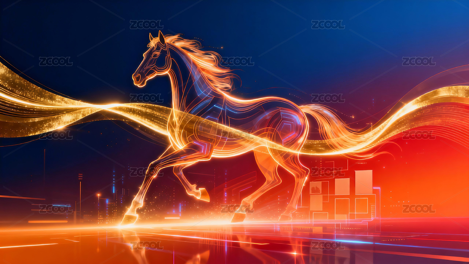 赛博朋克,机械马,霓虹,城市,未来,都市,科技感,科幻,炫酷,夜景