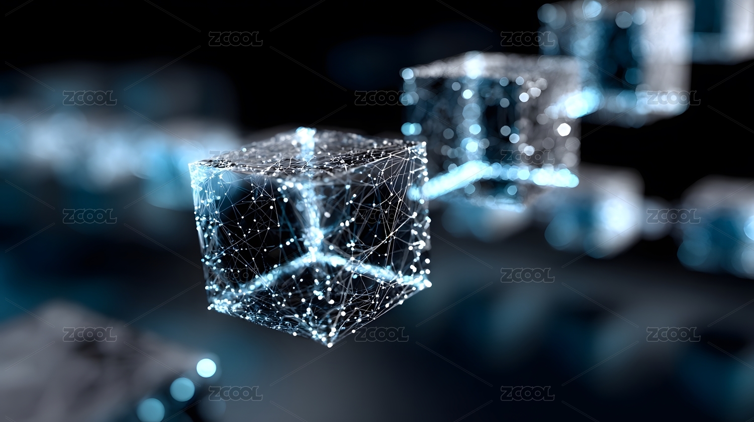 深蓝背景下发光透明蓝色立方体集群