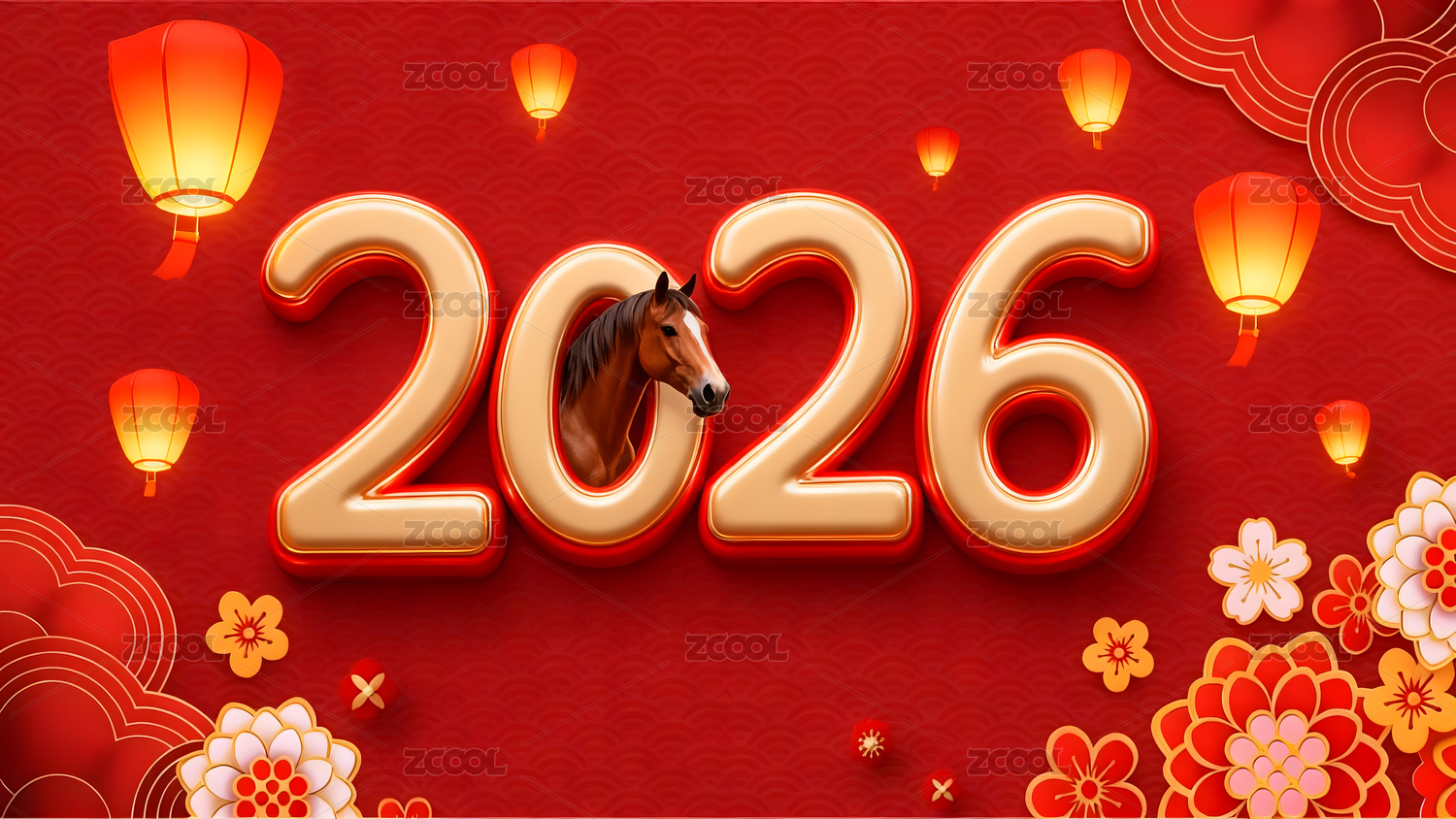 2026,马年,春节,喜庆,数字,生肖马,灯笼,花卉,贺岁,节日