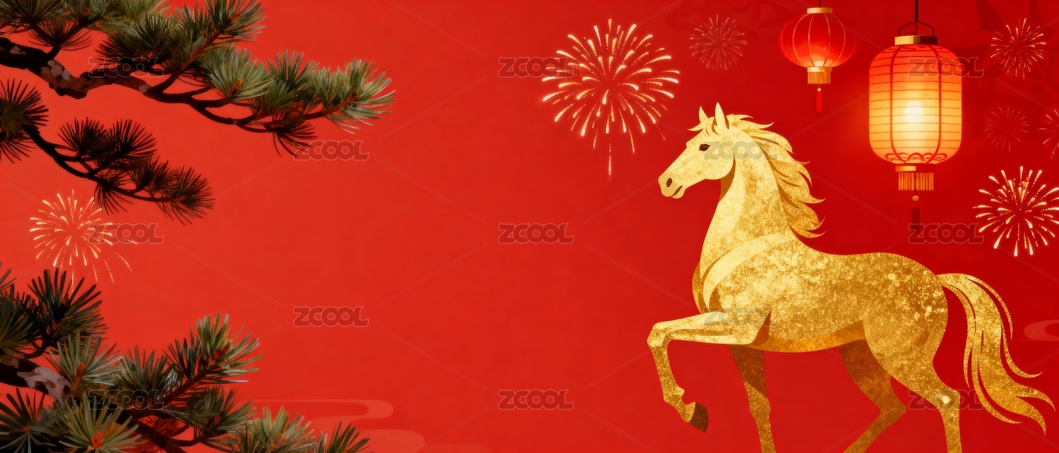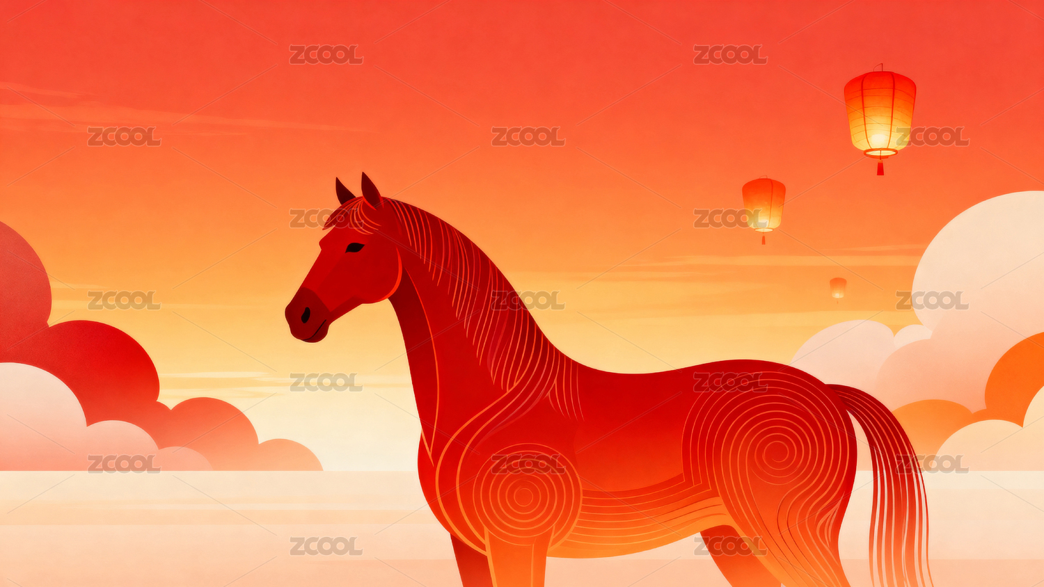 瑞马,烟花,灯笼,中国红,喜庆,节日,插画,祥云,传统,春节