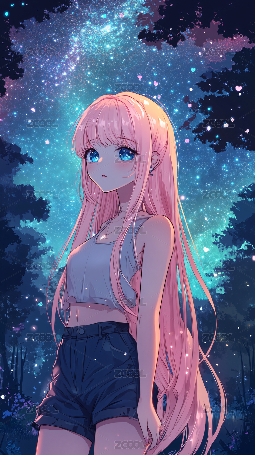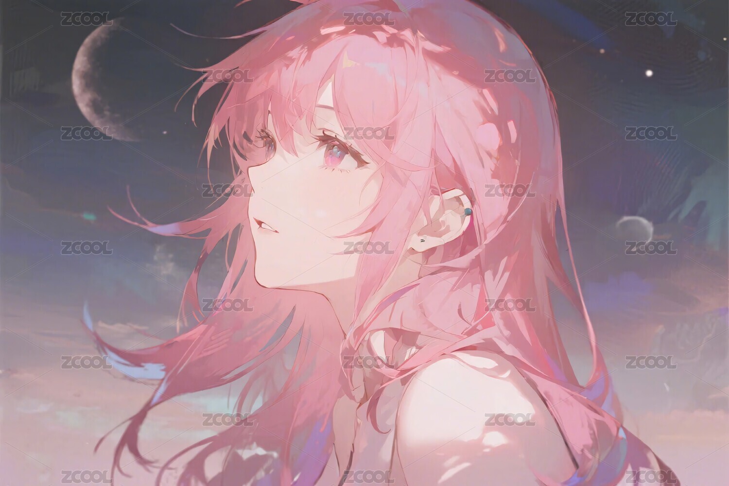粉发女孩星空插画