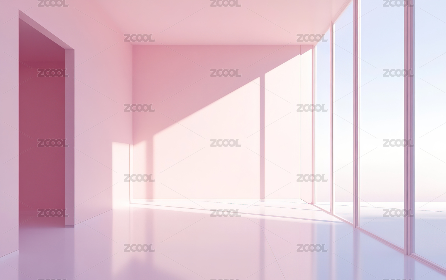粉色房间,大窗户,蓝天,白云,阳光,室内,空间,插画,背景,装饰