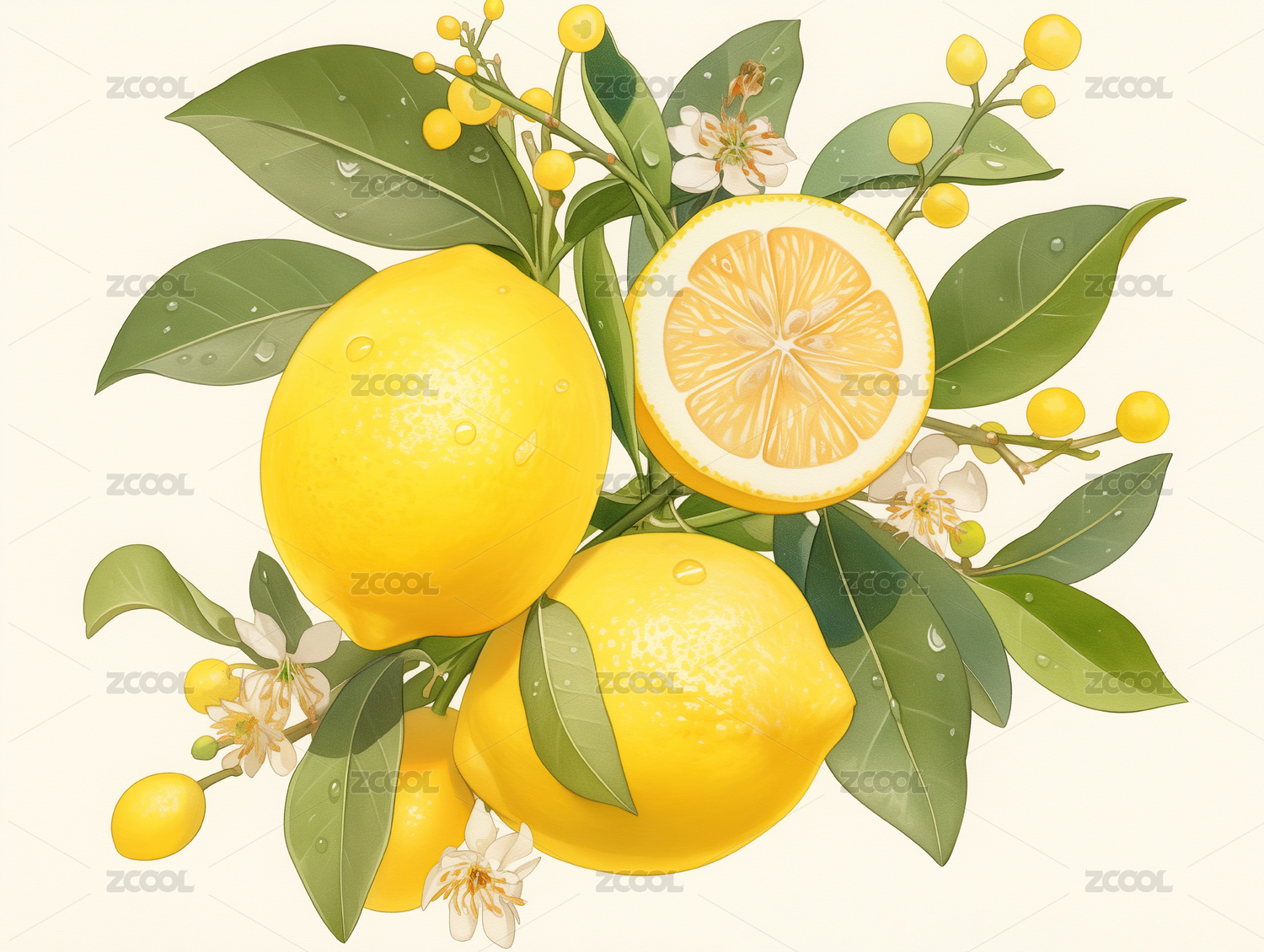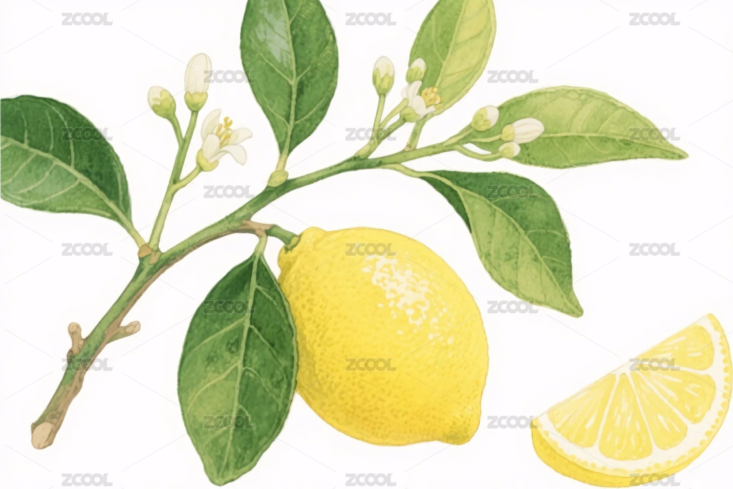 柠檬,叶子,花苞,柠檬片,插画,水彩,背景,植物,自然,美食