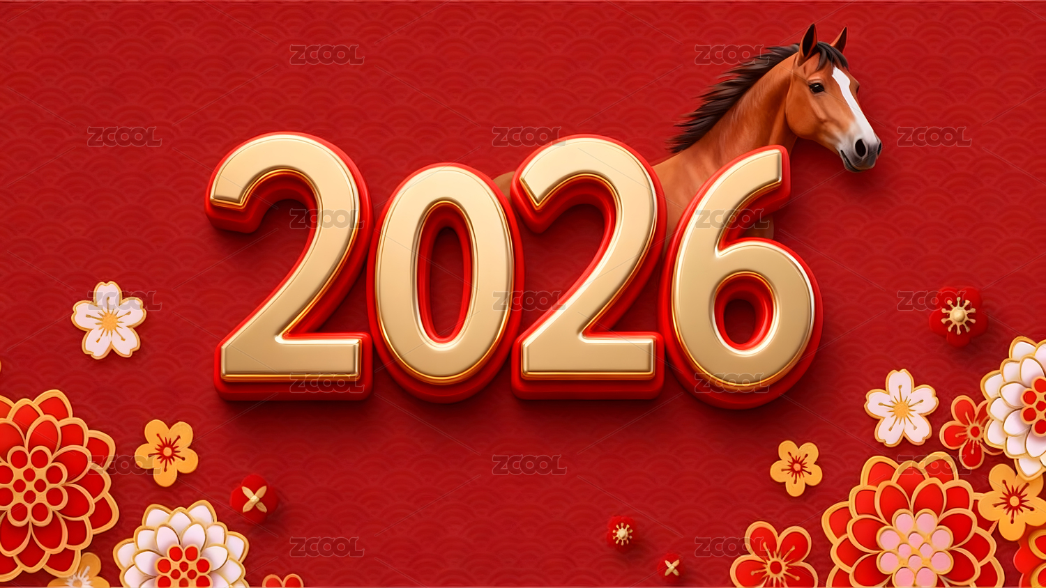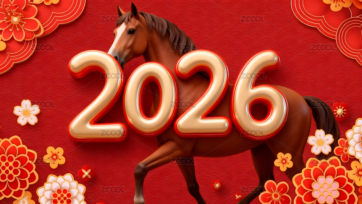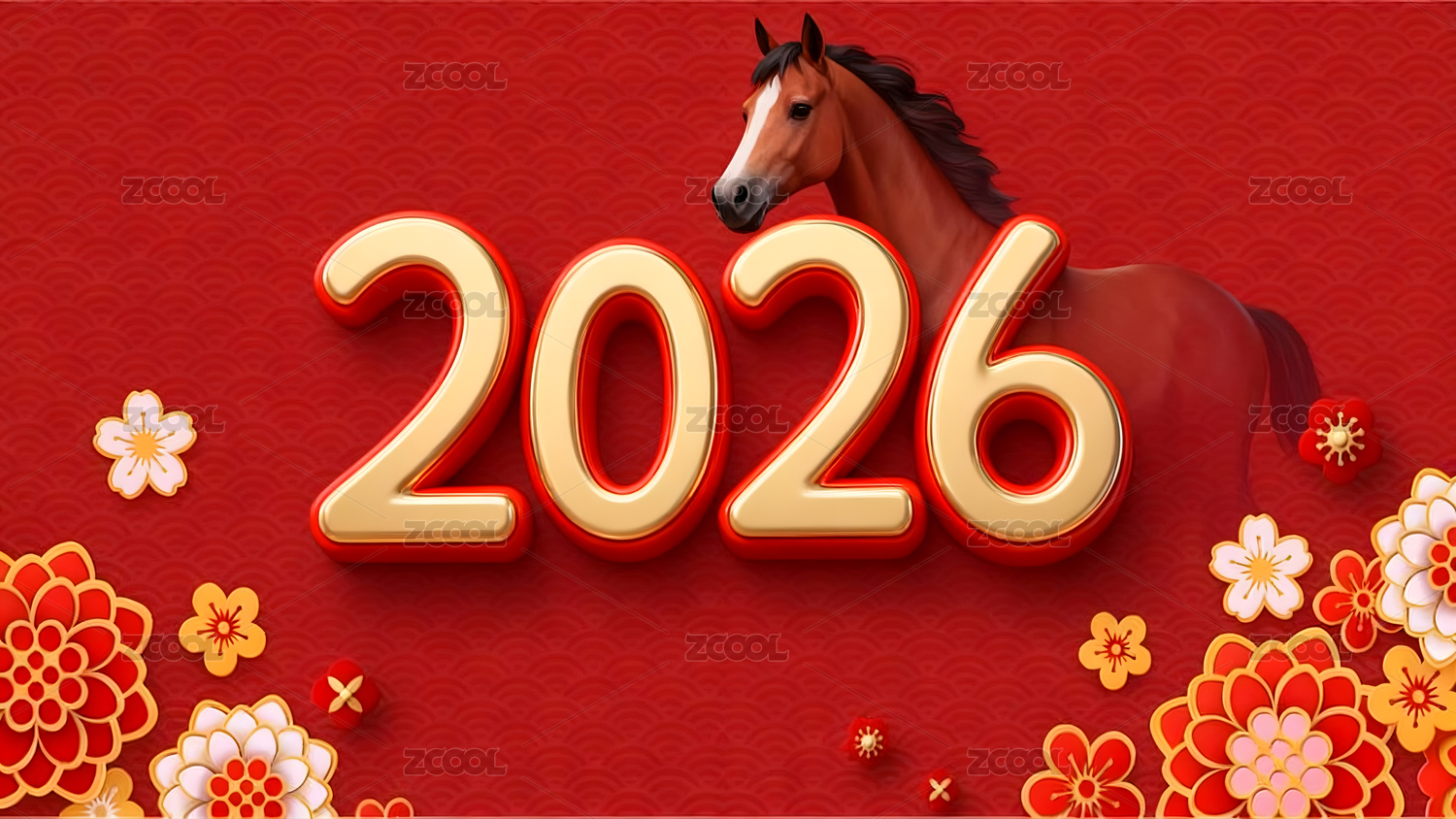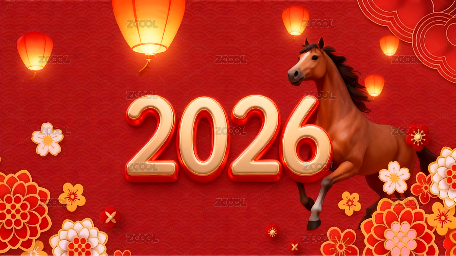 2026,马年,春节,喜庆,数字,生肖马,灯笼,花卉,贺岁,节日