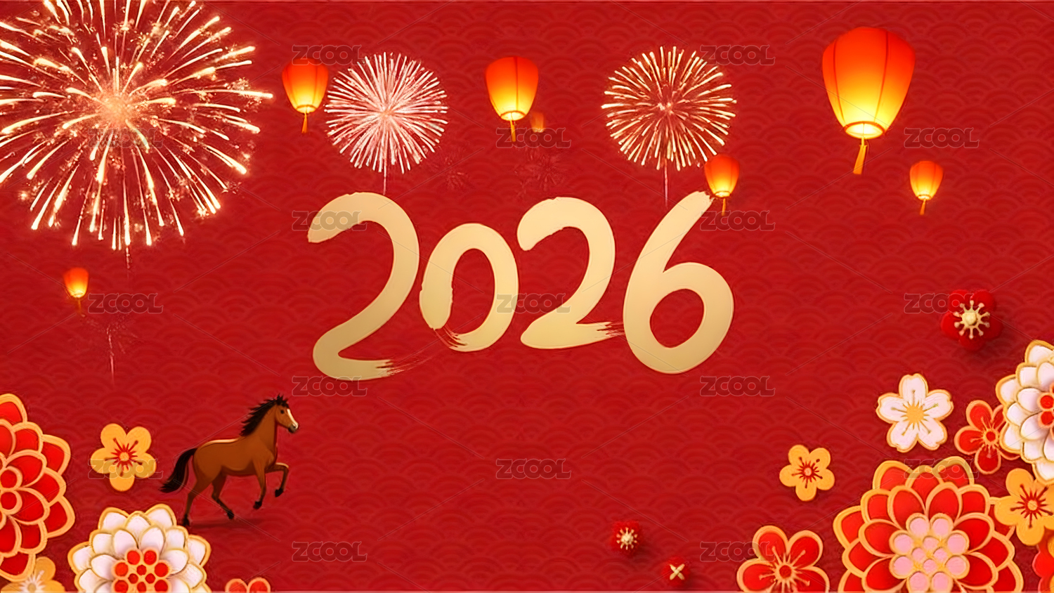 2026,新年,烟花,红色,背景,灯笼,喜庆,花朵,节日,装饰