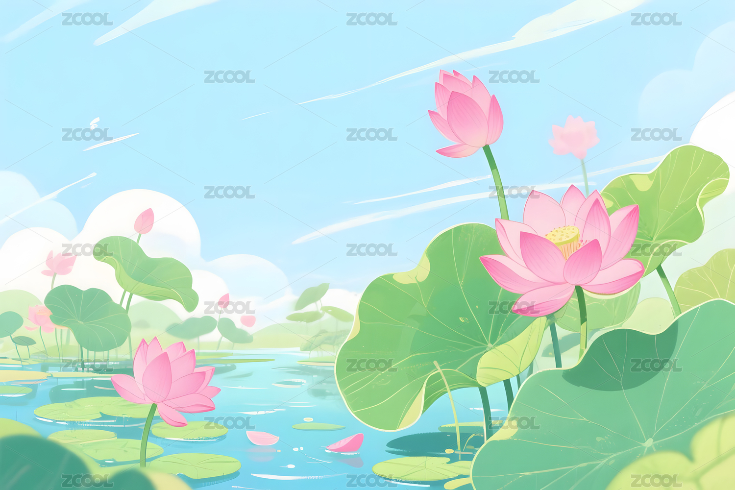 荷塘,荷花,荷叶,日出,阳光,水面,插画,风景,自然,植物