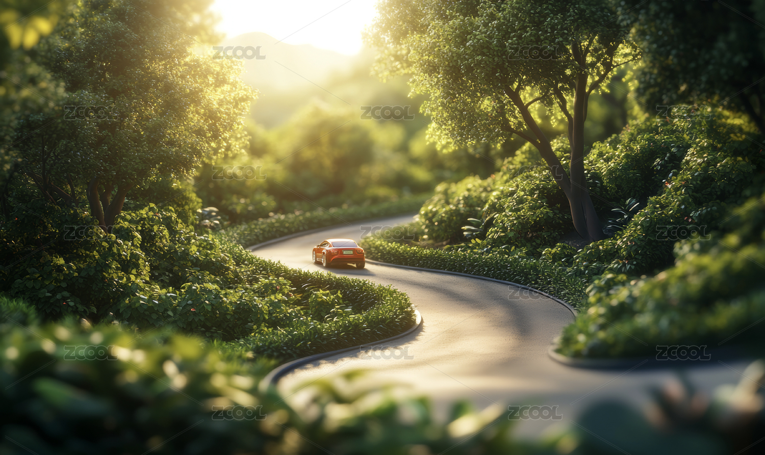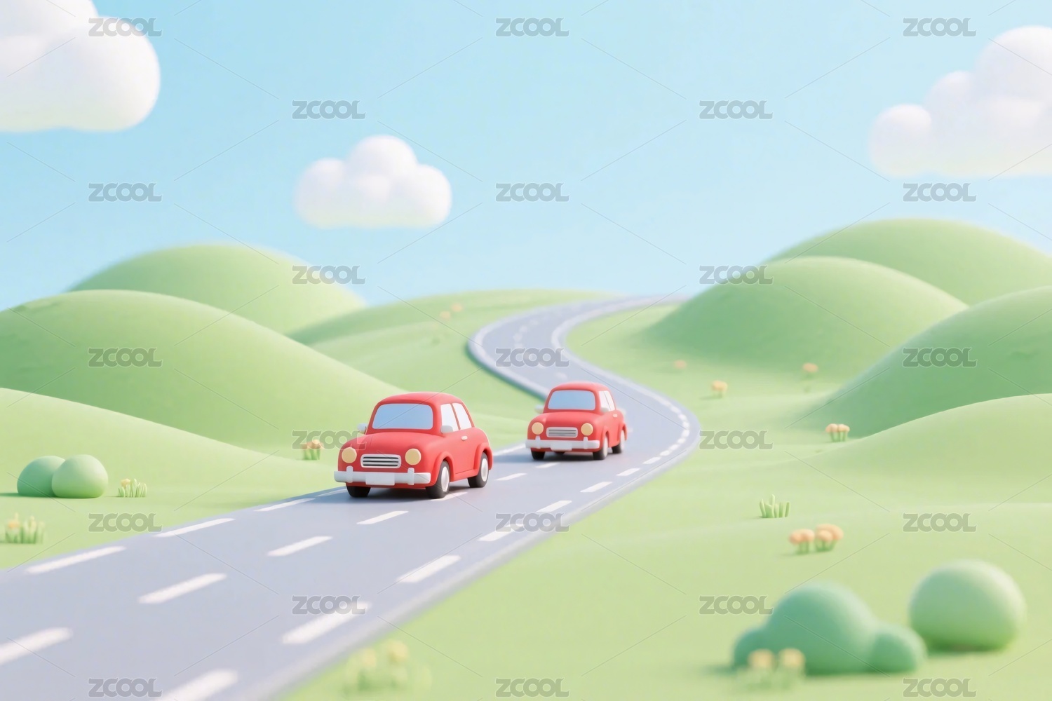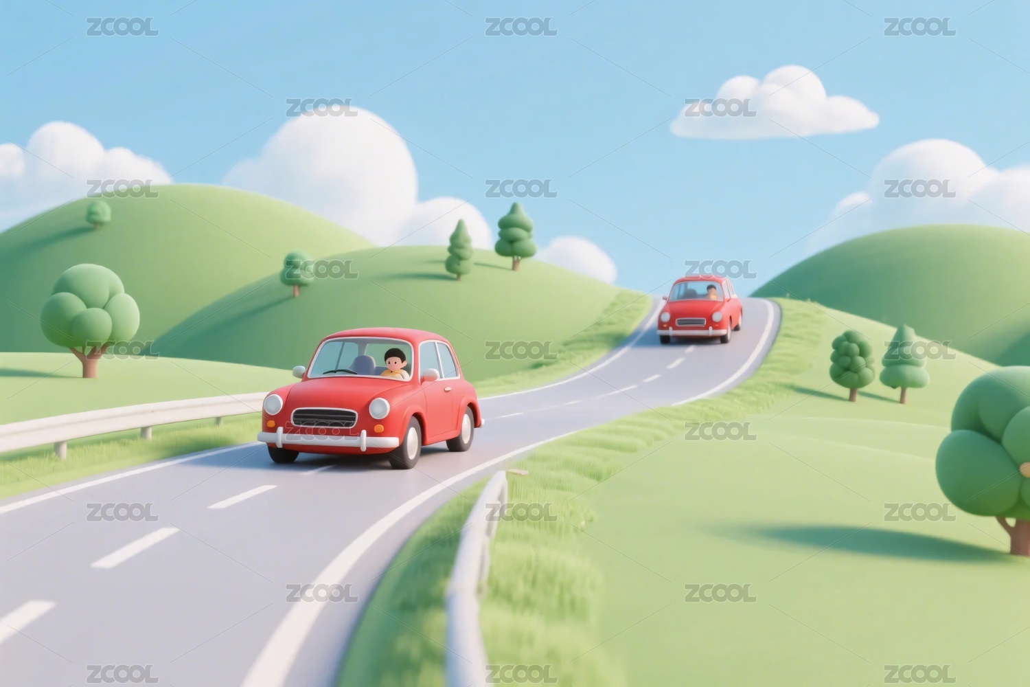 草地,丘陵,道路,红色汽车,卡通,风景,绿色,蜿蜒,自然,梦幻