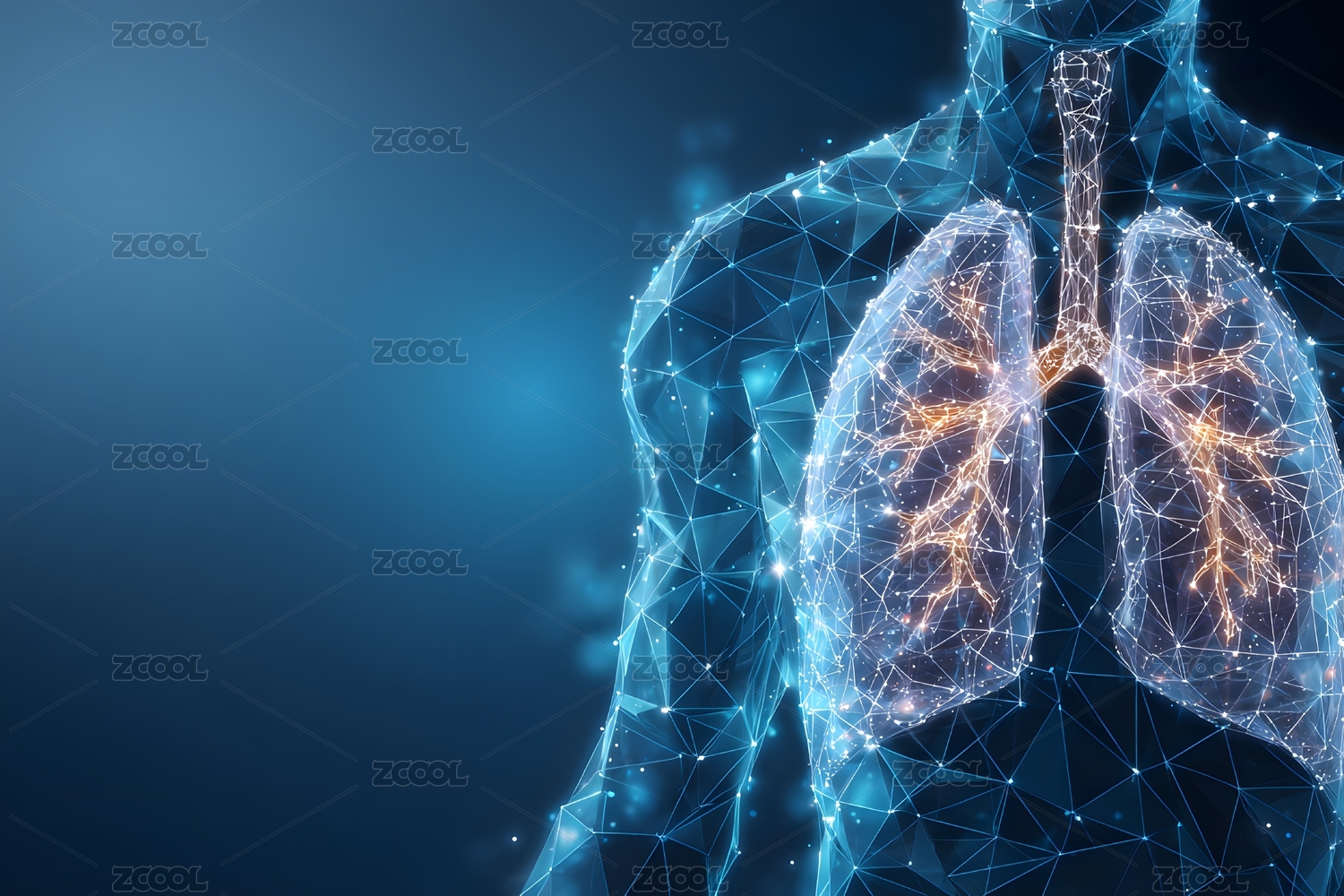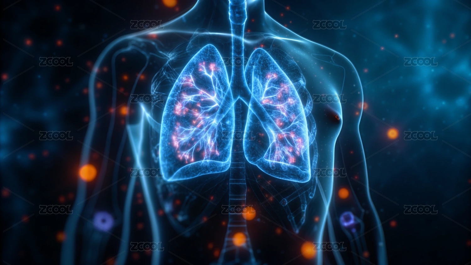 人体,肺部,医学影像,解剖学,呼吸系统,3D渲染,蓝色调,橙色光点,结构,示意图
