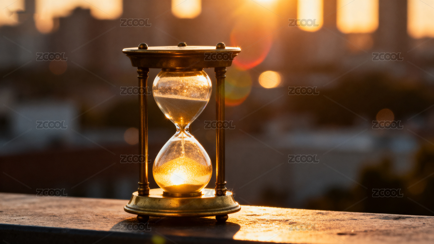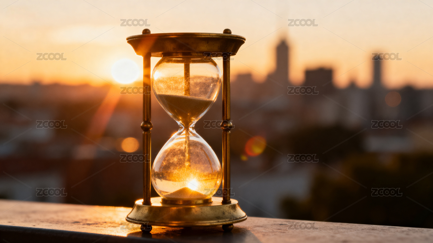 沙漏与夕阳的城市背景