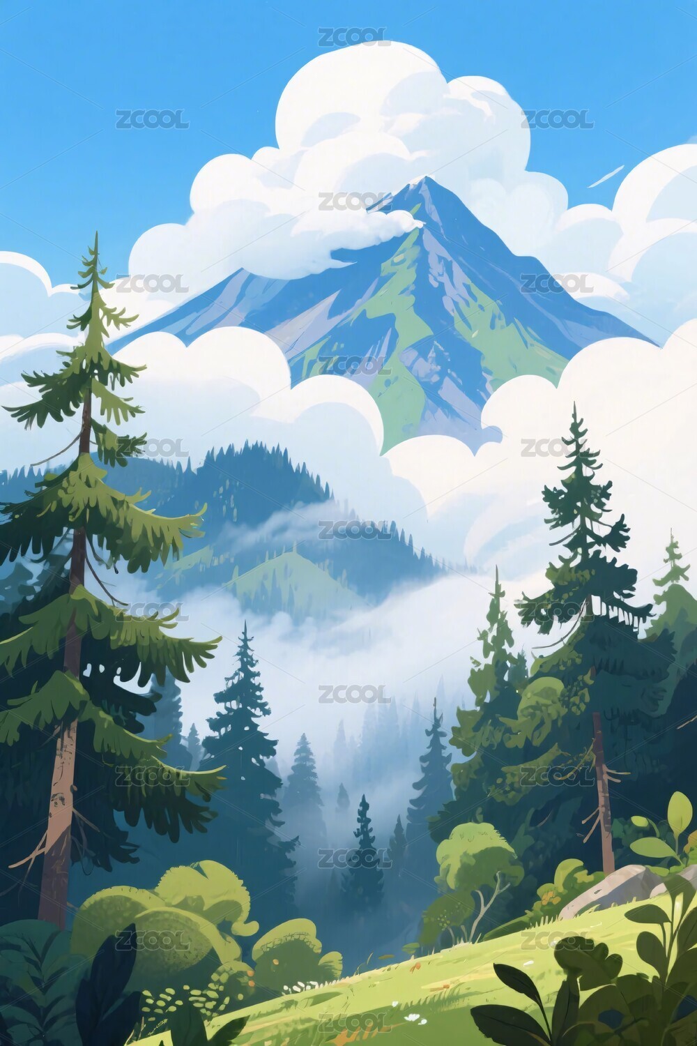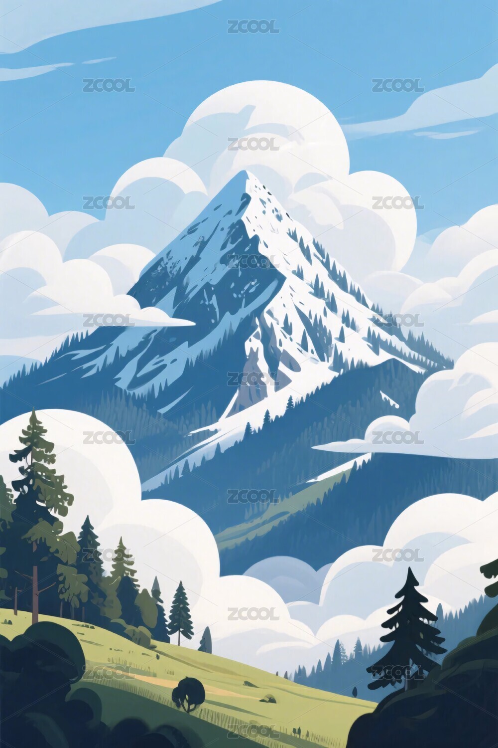 雪山,云朵,森林,草地,山脉,蓝天,山水,插画,模板,背景