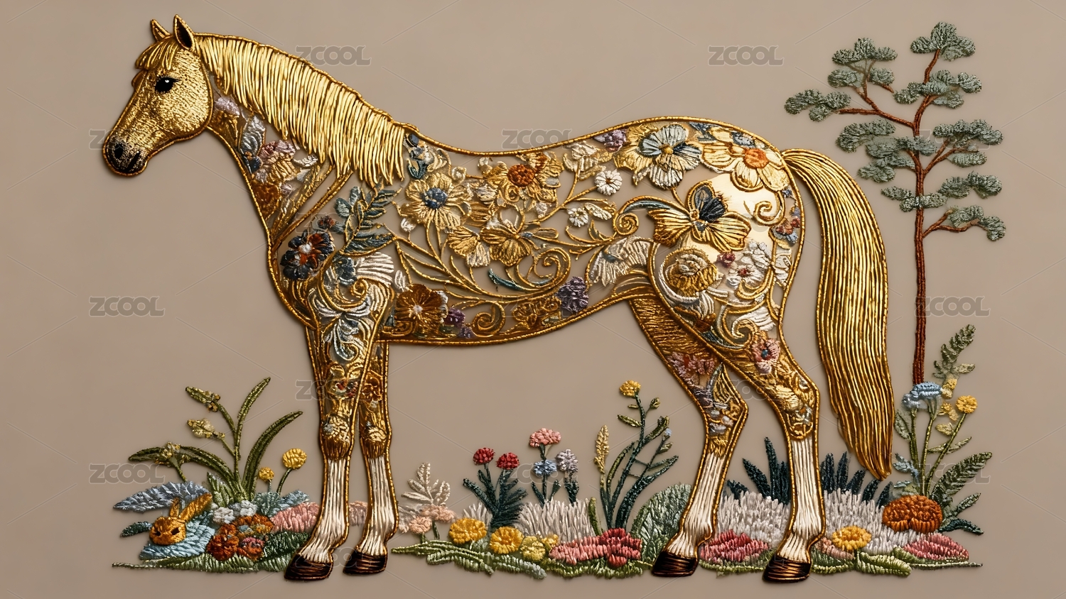 金色马头与花卉刺绣图案