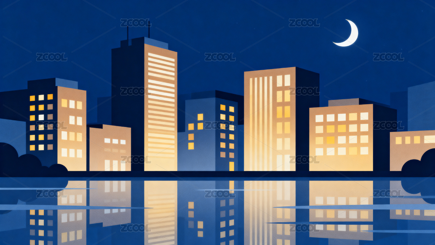 夜幕下的城市高楼与弯月星辰