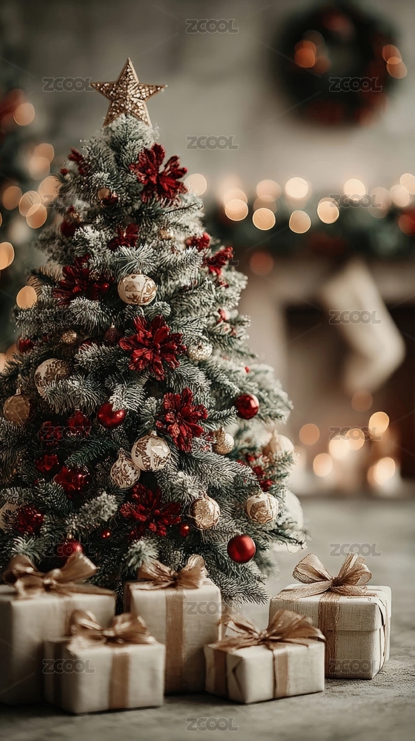 圣诞树,礼物,礼盒,红色,金色,圣诞球,球形装饰,灯光,节日,装饰