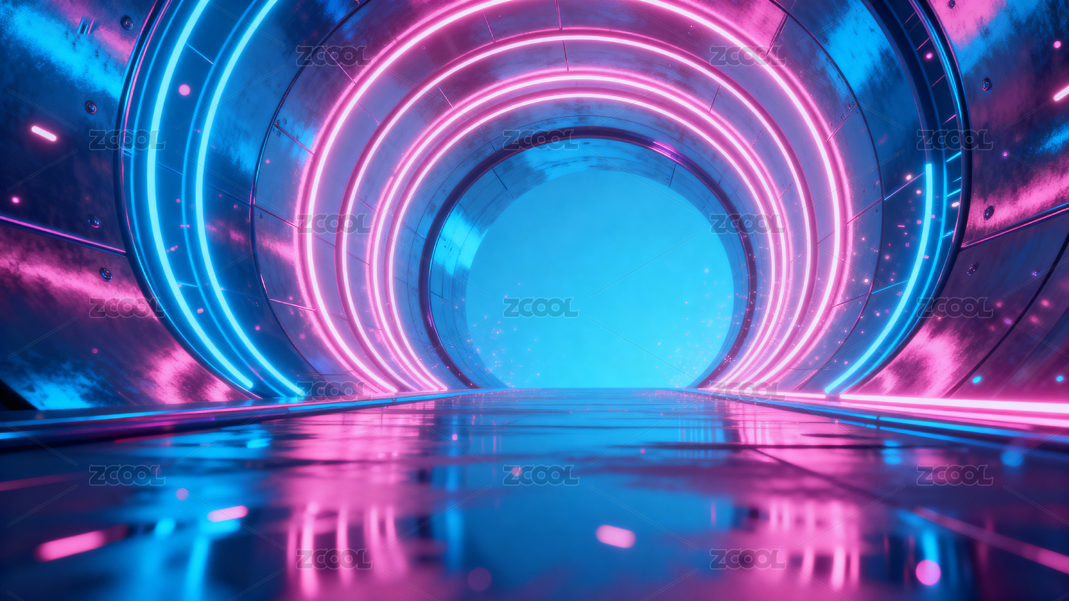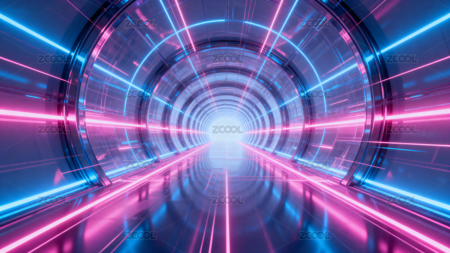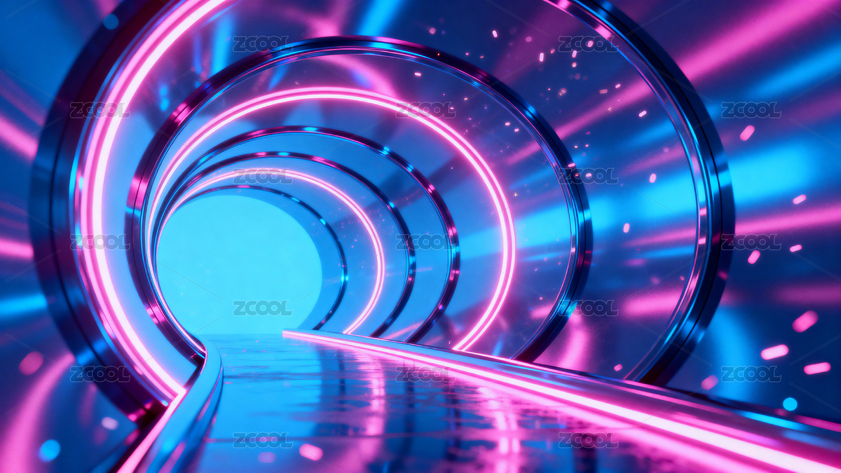 霓虹光带环绕的科幻隧道空间