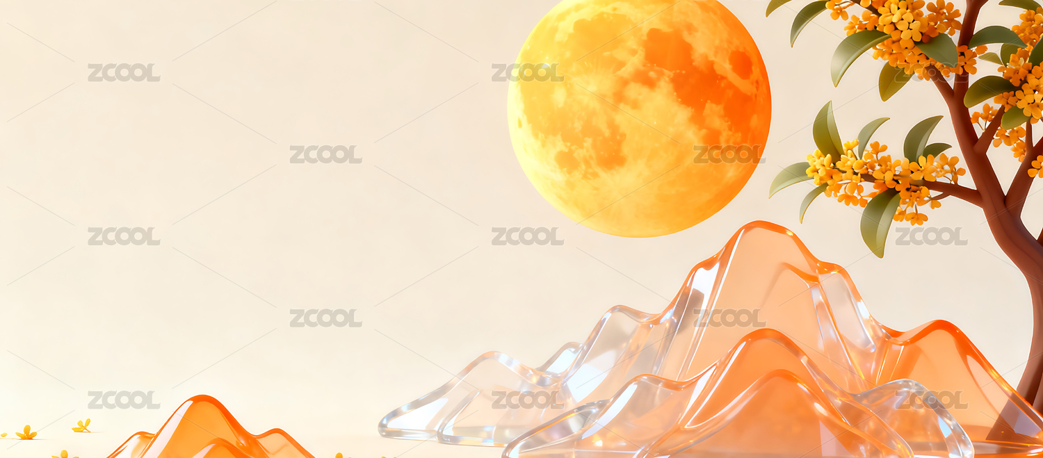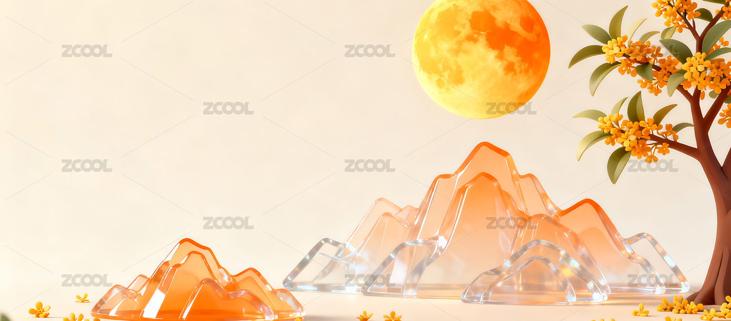 中秋节,3D,玻璃质感,山脉,山峰,月亮,桂花,桂花树,背景,海报