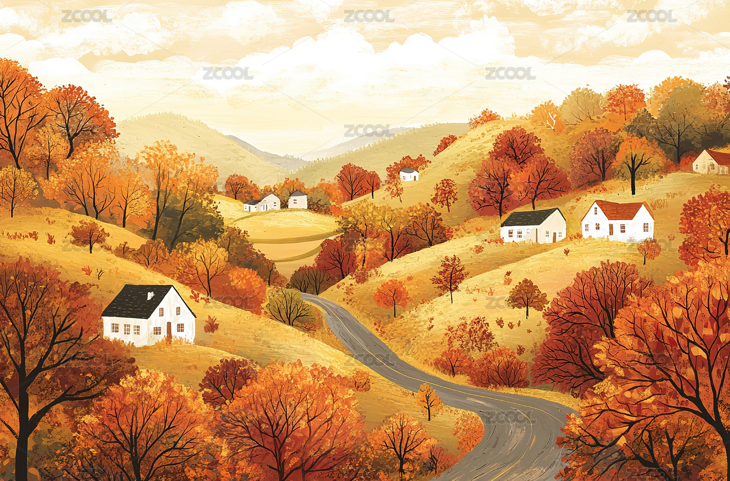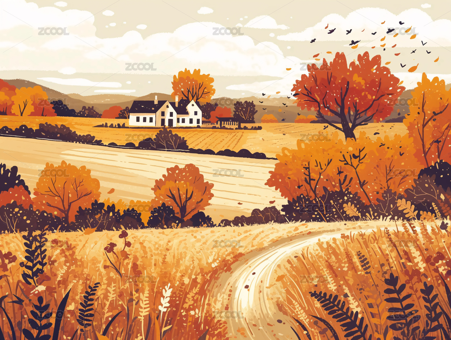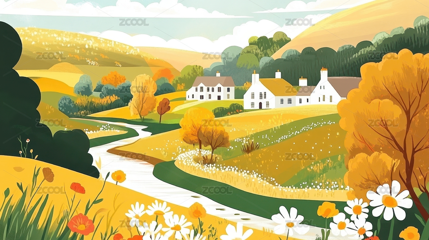 小屋,房屋,田野,花草,树木,秋景,乡村,秋季,风景,插画