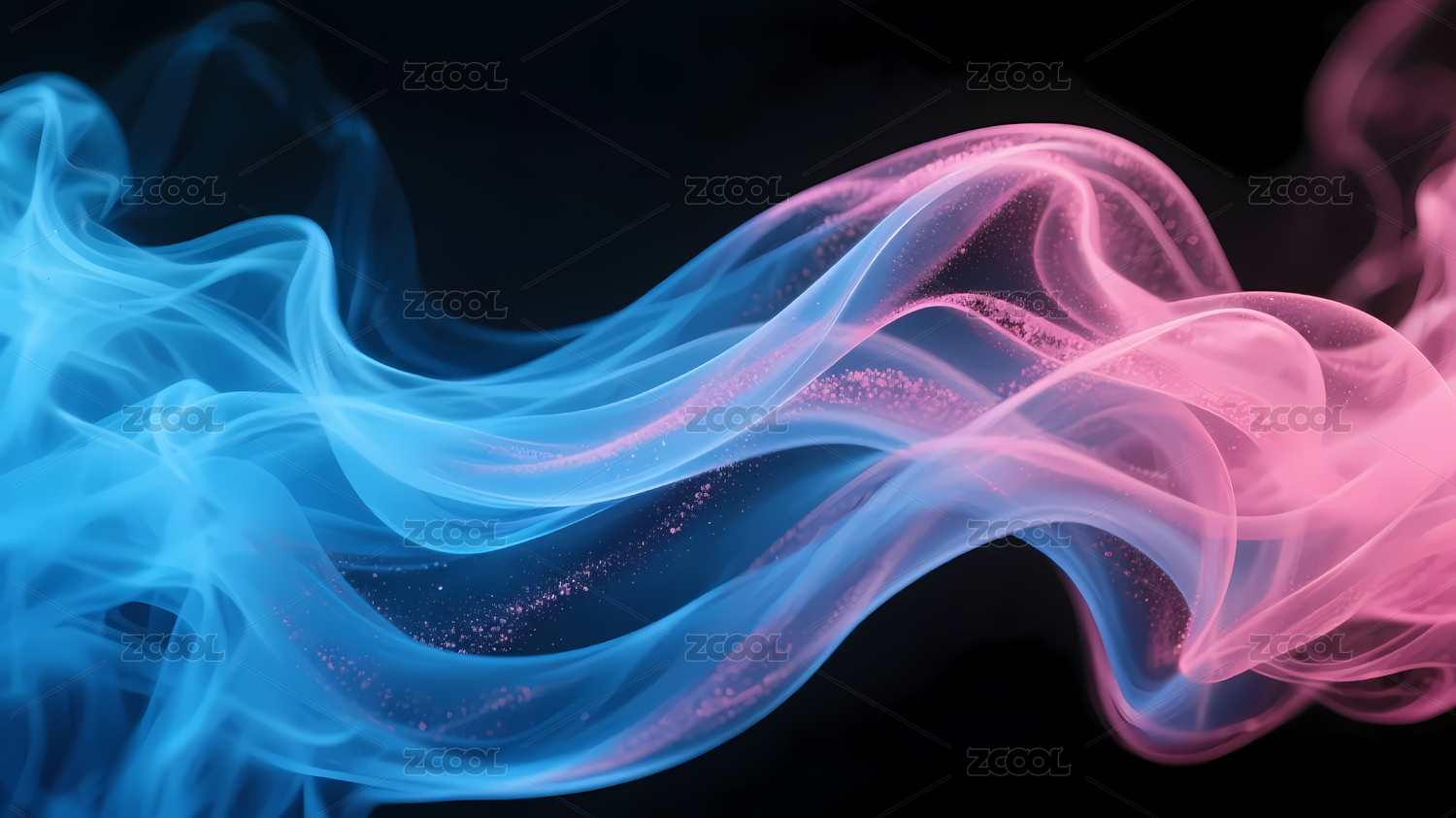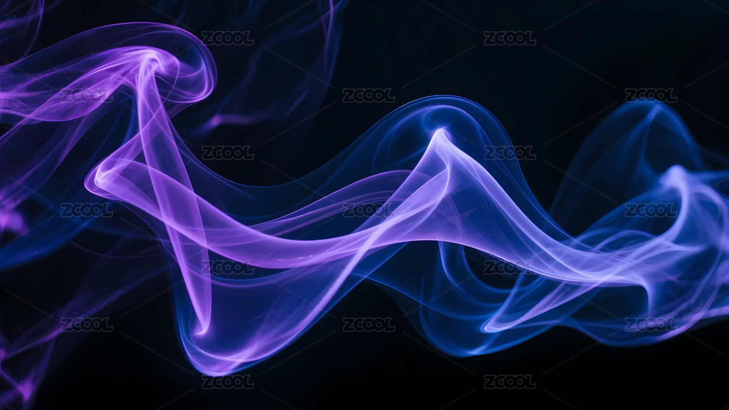 抽象蓝紫色烟雾线条在黑色背景上漂浮