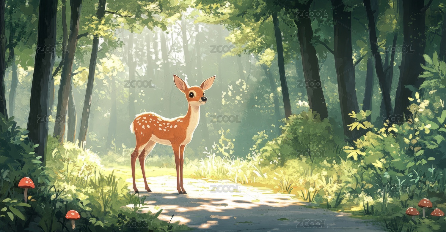 晴朗的天空,草地上一群小动物在愉快的玩耍